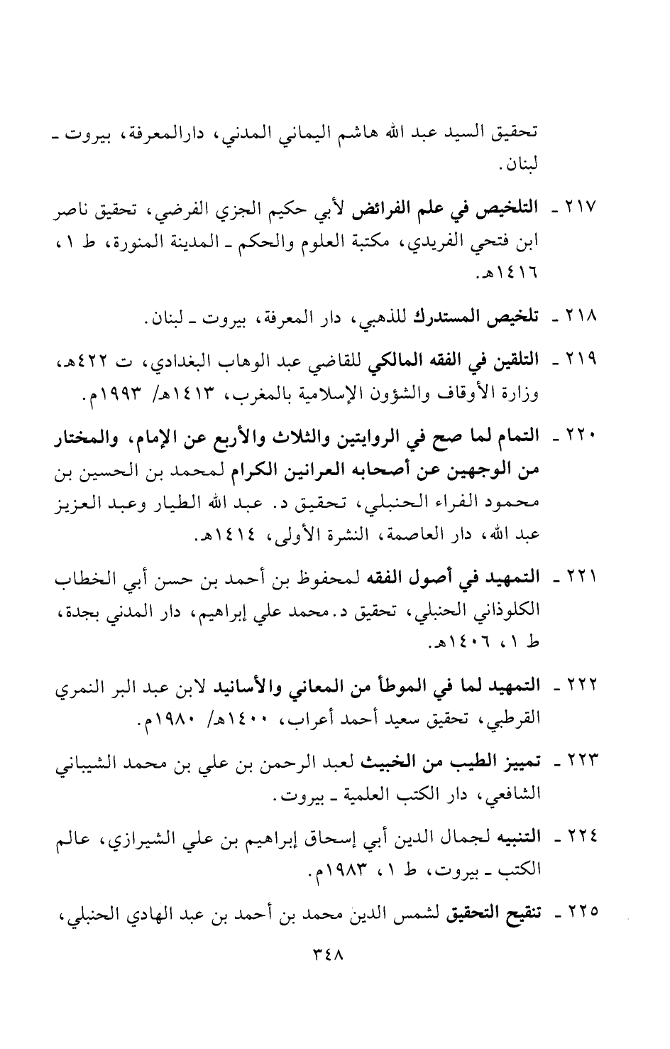 ٢١٩ - التلقين في الفقه المالكي للقاضي عبد الوهاب البغدادي، ت ٤٢٢ هـ، وزارة الأوقاف والشؤون الإسلامية بالمغرب، ١٤١٣ هـ / ١٩٩٣ م.