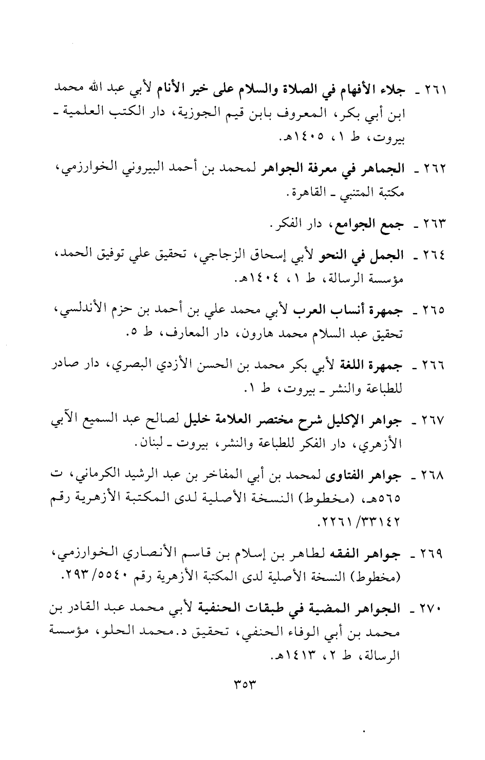 ٢٦٢ - الجماهر في معرفة الجواهر لمحمد بن أحمد البيروني الخوارزمي، مكتبة المتنبي - القاهرة.