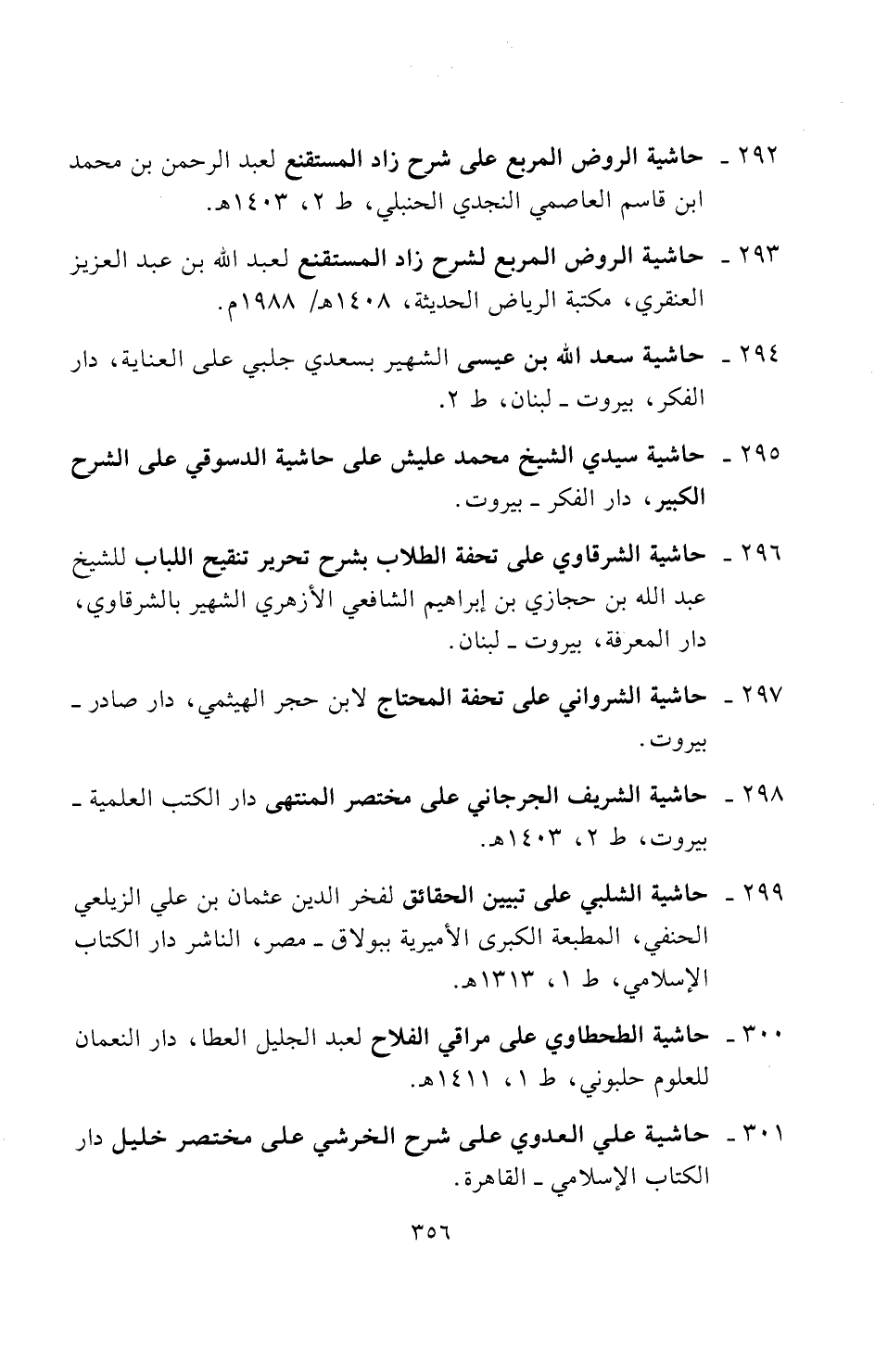 ٢٩٢ - حاشية الروض المربع على شرح زاد المستقنع لعبد الرحمن بن محمد ابن قاسم العاصمي النجدي الحنبلي، ط ٢، ١٤٠٣ هـ.