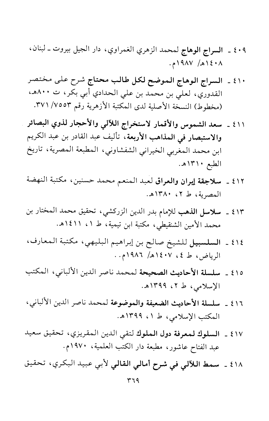 ٤٠٩ - السراج الوهاج لمحمد الزهري الغمراوي، دار الجيل بيروت - لبنان، ١٤٠٨ هـ/ ١٩٨٧ م.