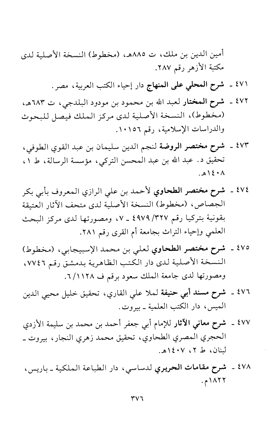 ٤٧٥ - شرح مختصر الطحاوي لعلي بن محمد الإسبيجابي، (مخطوط) النسخة الأصلية لدى دار الكتب الظاهرية بدمشق رقم ٧٧٤٦، ومصورتها لدى جامعة الملك سعود برقم ف ١١٢٨/ ٦.