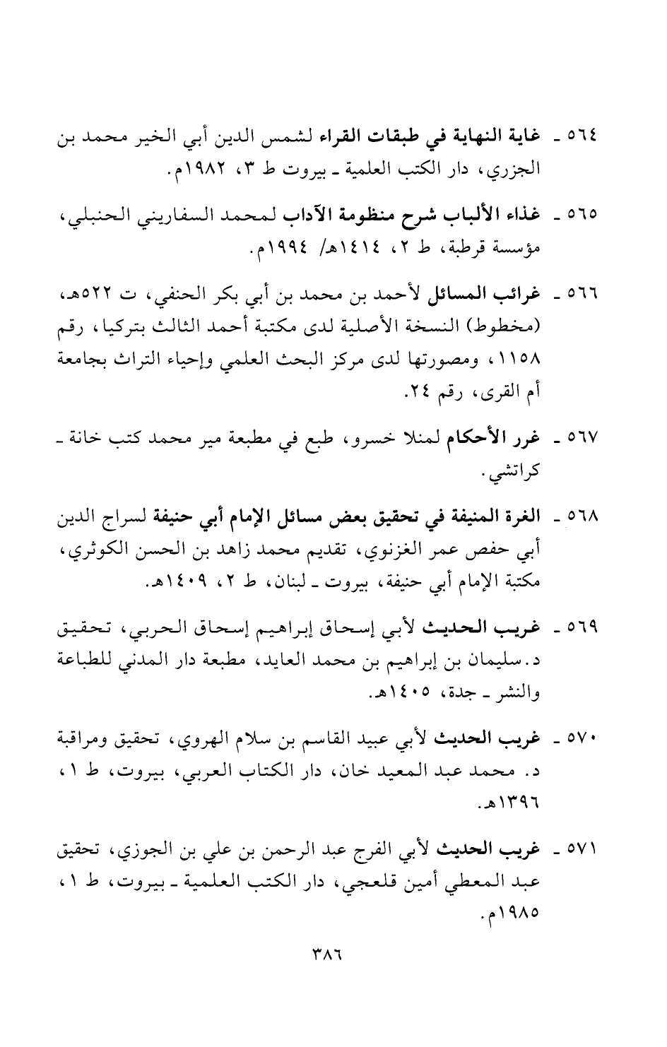 ٥٧١ - غريب الحديث لأبي الفرج عبد الرحمن بن علي بن الجوزي، تحقيق عبد المعطي أمين قلعجي، دار الكتب العلمية - بيروت، ط ١، ١٩٨٥ م.
