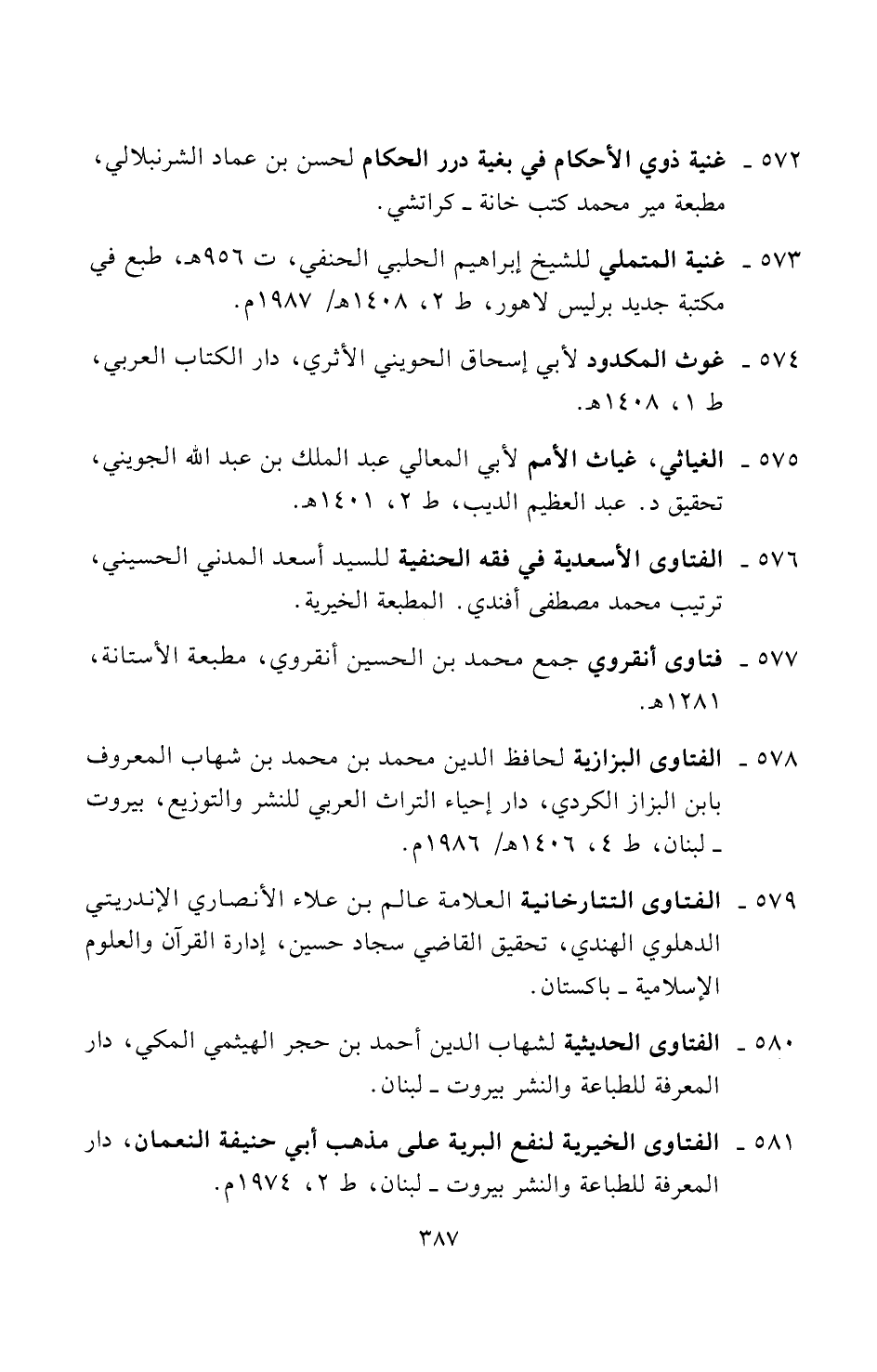 ٥٧٣ - غنية المتملي للشيخ إبراهيم الحلبي الحنفي، ت ٩٥٦ هـ، طبع في مكتبة جديد برليس لاهور، ط ٢، ١٤٠٨ هـ / ١٩٨٧ م.