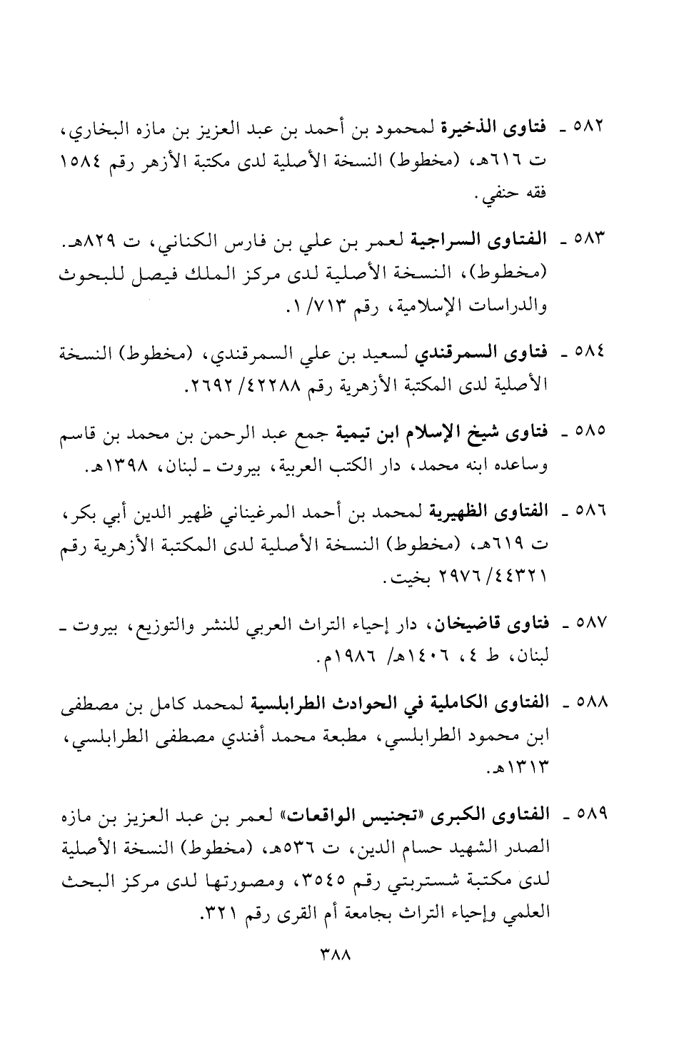 ٥٨٩ - الفتاوى الكبرى "تجنيس الواقعات" لعمر بن عبد العزيز بن مازه الصدر الشهيد حسام الدين، ت ٥٣٦ هـ، (مخطوط) النسخة الأصلية لدى مكتبة شستربتي رقم ٣٥٤٥، ومصورتها لدى مركز البحث العلمي وإحياء التراث بجامعة أم القرى رقم ٣٢١.