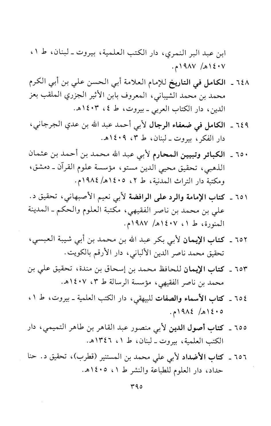 ٦٥٣ - كتاب الإيمان للحافظ محمد بن إسحاق بن مندة، تحقيق علي بن محمد بن ناصر الفقيهي، مؤسسة الرسالة ط ٣، ١٤٠٧ هـ.