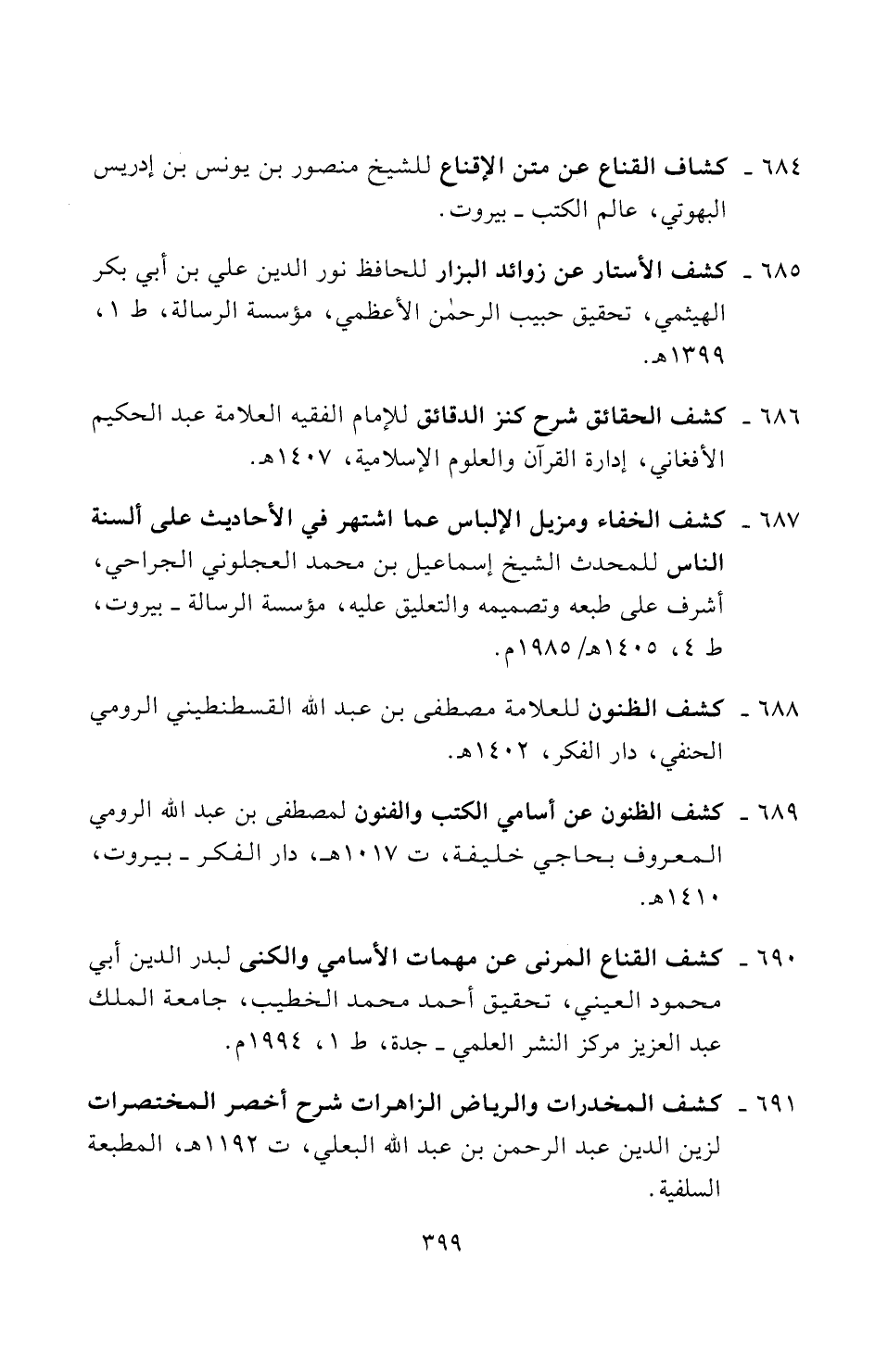 ٦٨٨ - كشف الظنون للعلامة مصطفى بن عبد الله القسطنطيني الرومي الحنفي، دار الفكر، ١٤٠٢ هـ.