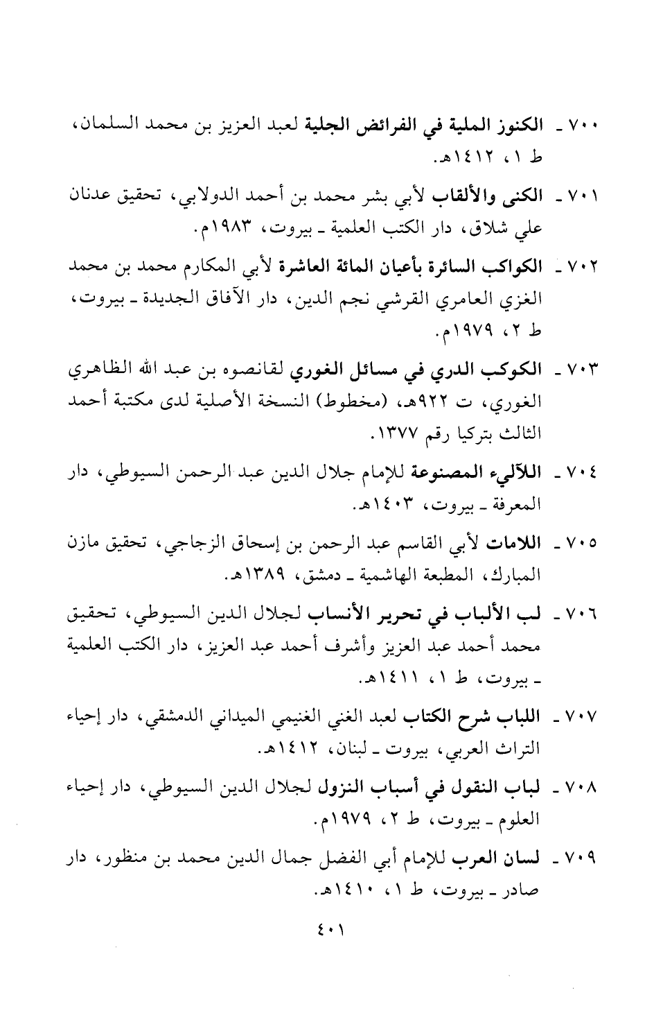 ٧٠٦ - لب الألباب في تحرير الأنساب لجلال الدين السيوطي، تحقيق محمد أحمد عبد العزيز وأشرف أحمد عبد العزيز، دار الكتب العلمية - بيروت، ط ١، ١٤١١ هـ.