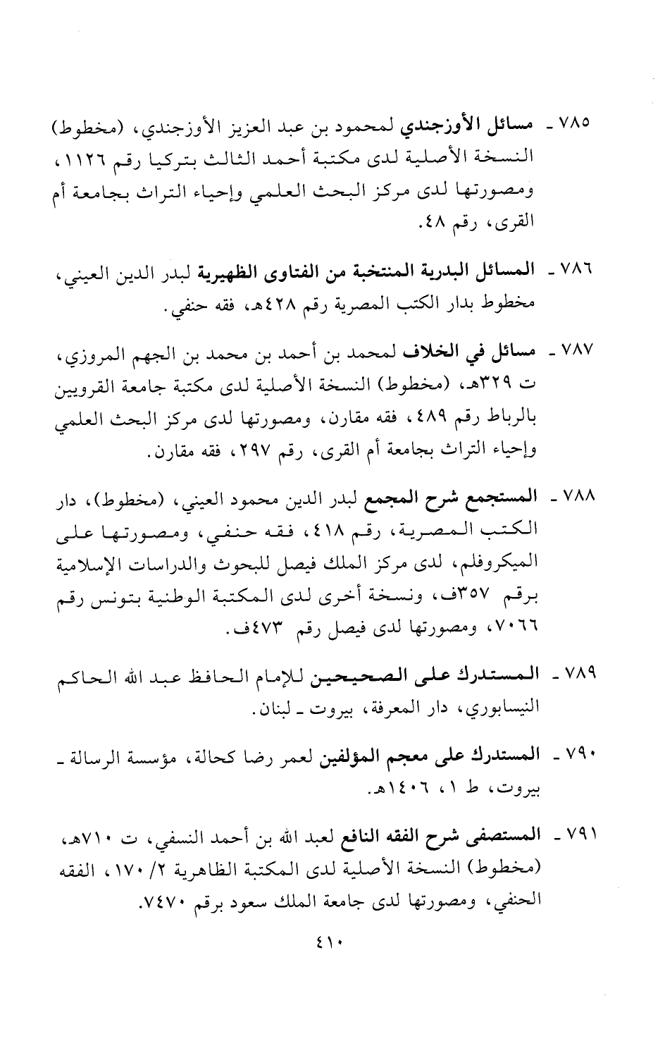٧٨٨ - المستجمع شرح المجمع لبدر الدين محمود العيني، (مخطوط)، دار الكتب المصرية، رقم ٤١٨، فقه حنفي، ومصورتها على الميكروفلم، لدى مركز الملك فيصل للبحوث والدراسات الإسلامية برقم ٣٥٧ ف، ونسخة أخرى لدى المكتبة الوطنية بتونس رقم ٧٠٦٦، ومصورتها لدى فيصل رقم ٤٧٣ ف.