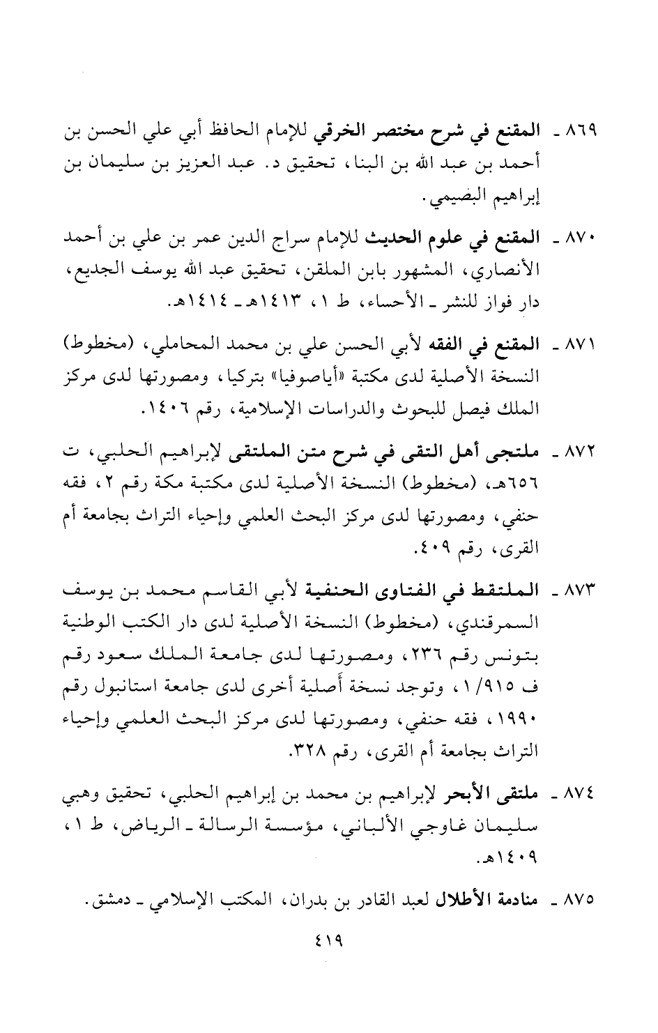 ٨٧٤ - ملتقى الأبحر لإبراهيم بن محمد بن إبراهيم الحلبي، تحقيق وهبي سليمان غاوجي الألباني، مؤسسة الرسالة - الرياض، ط ١، ١٤٠٩ هـ.