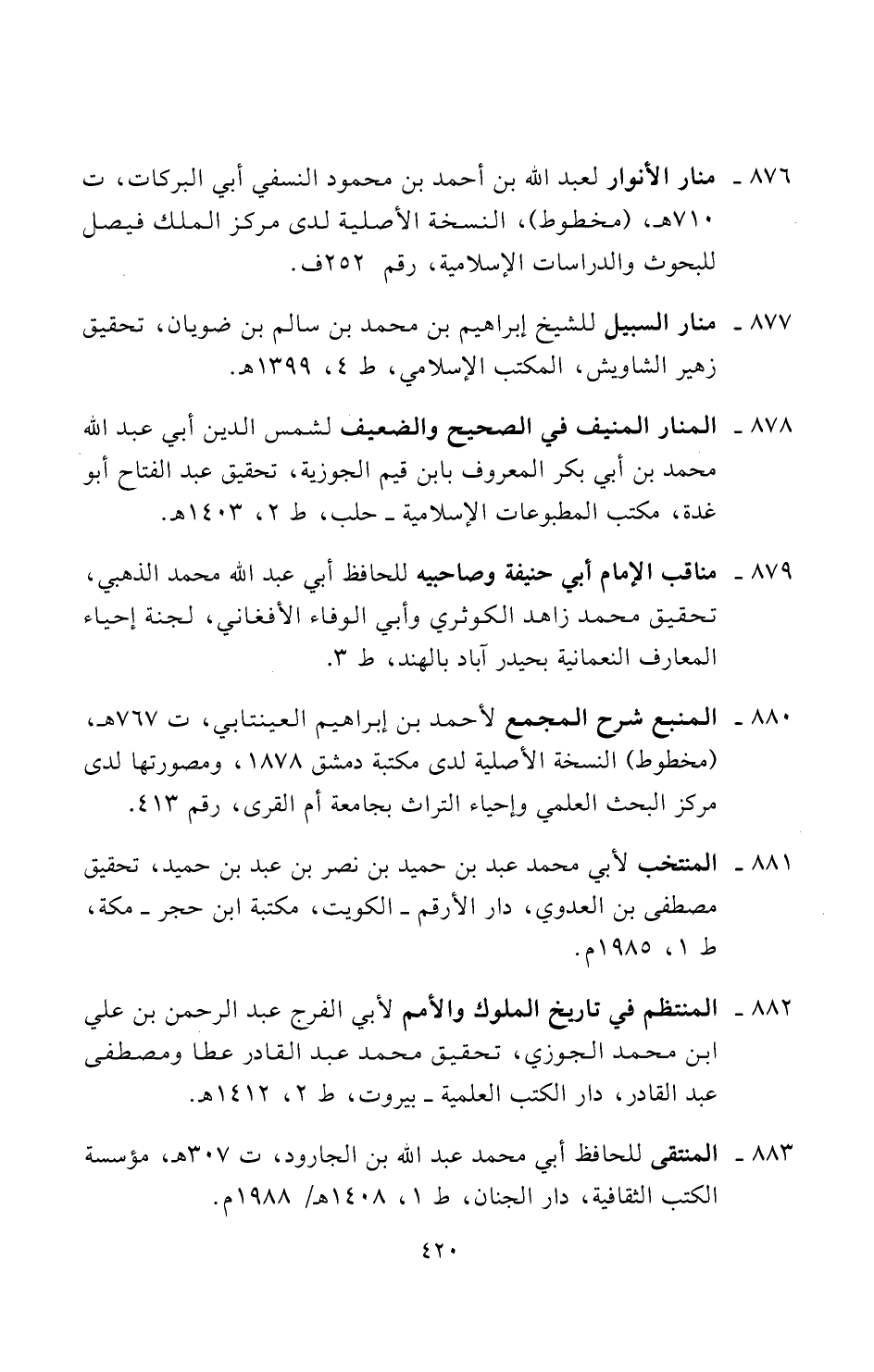 ٨٨٢ - المنتظم في تاريخ الملوك والأمم لأبي الفرج عبد الرحمن بن علي ابن محمد الجوزي، تحقيق محمد عبد القادر عطا ومصطفى عبد القادر، دار الكتب العلمية - بيروت، ط ٢، ١٤١٢ هـ.