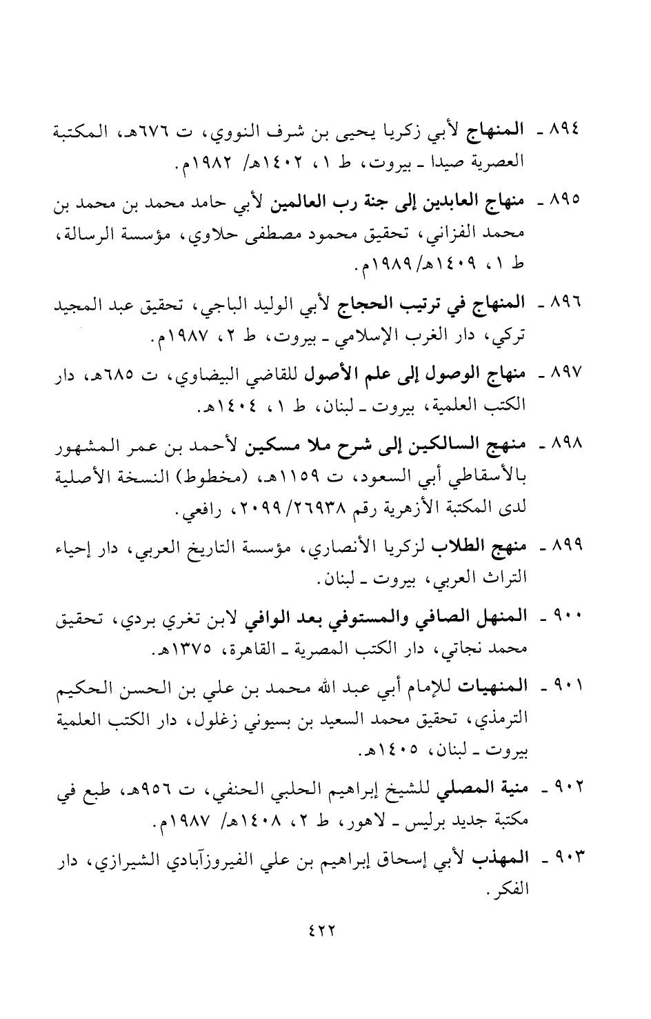 ٨٩٩ - منهج الطلاب لزكريا الأنصاري، مؤسسة التاريخ العربي، دار إحياء التراث العربي، بيروت - لبنان.