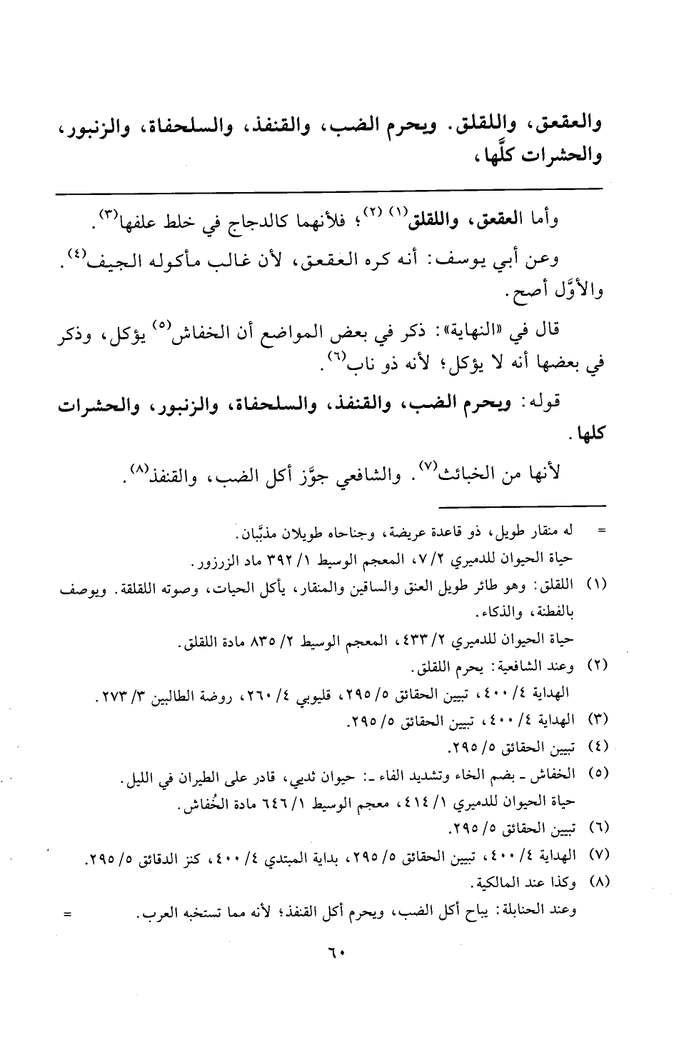 والعقعق، واللقلق. ويحرم الضب، والقنفذ، والسلحفاة، والزنبور، والحشرات كلَّها،