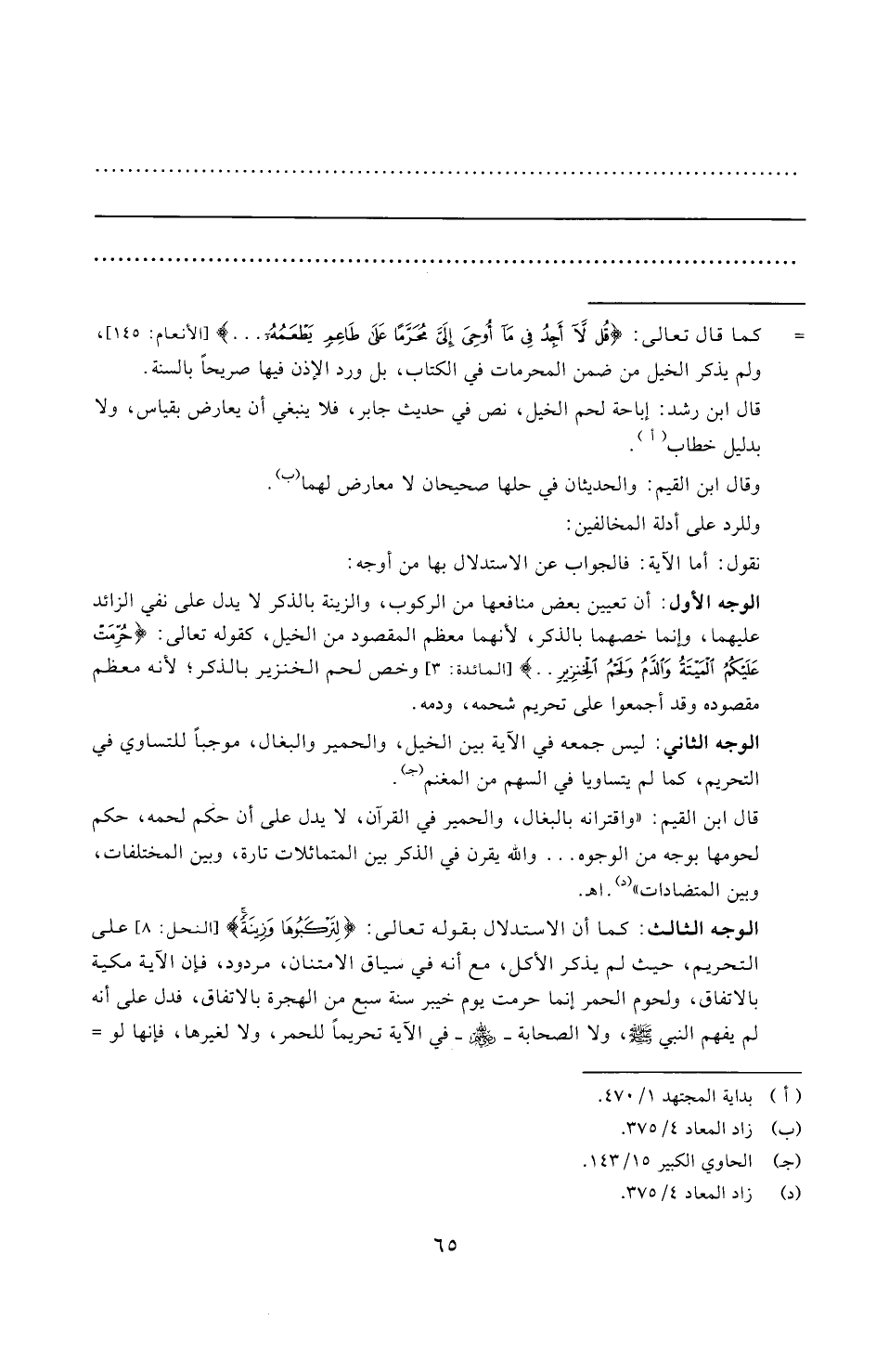 = كما قال تعالى: {قُلْ لَا أَجِدُ فِي مَا أُوحِيَ إِلَيَّ مُحَرَّمًا عَلَى طَاعِمٍ يَطْعَمُهُ ... } [الأنعام: ١٤٥]، ولم يذكر الخيل من ضمن المحرمات في الكتاب، بل ورد الإذن فيها صريحًا بالسنة.