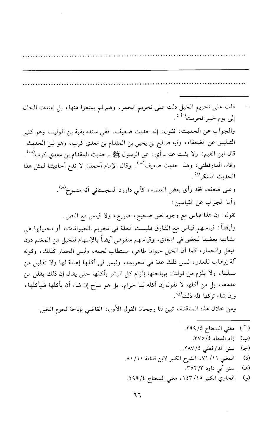 وأيضًا: قياسهم قياس مع الفارق فليست العلة في تحريم الحيوانات، أو تحليلها هي مشابهة بعضها لبعض في الخلق، وقياسهم منقوض أيضًا بالإسهام للخيل من المغنم دون البغل والحمار، كما أن الخيل حيوان طاهر، مستطاب لحمه، وليس الحمار كذلك، وكونه آلة إرهاب للعدو، ليس ذلك علة في تحريمه، وليس في أكلها إهانة لها ولا تقليل من نسلها، ولا يلزم من قولنا: بإباحتها إلزام كل البشر بأكلها حتى يقال إن ذلك يقلل من عددها، بل من أكلها لا نقول إن أكله لها حرام، بل هو مباح إن شاء أن يأكلها فليأكلها، وإن شاء تركها فله ذلك (و).