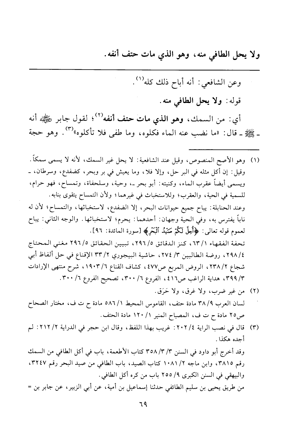 وقد أخرج أبو داود في السنن ٣/ ٣/ ٣٥٨ كتاب الأطعمة، باب في أكل الطافي من السمك رقم ٣٨١٥، وابن ماجه ٢/ ١٠٨١ كتاب الصيد، باب الطافي من صيد البحر رقم ٣٢٤٧، والبيهقي في السنن الكبرى ٩/ ٢٥٥ باب من كره أكل الطافي.