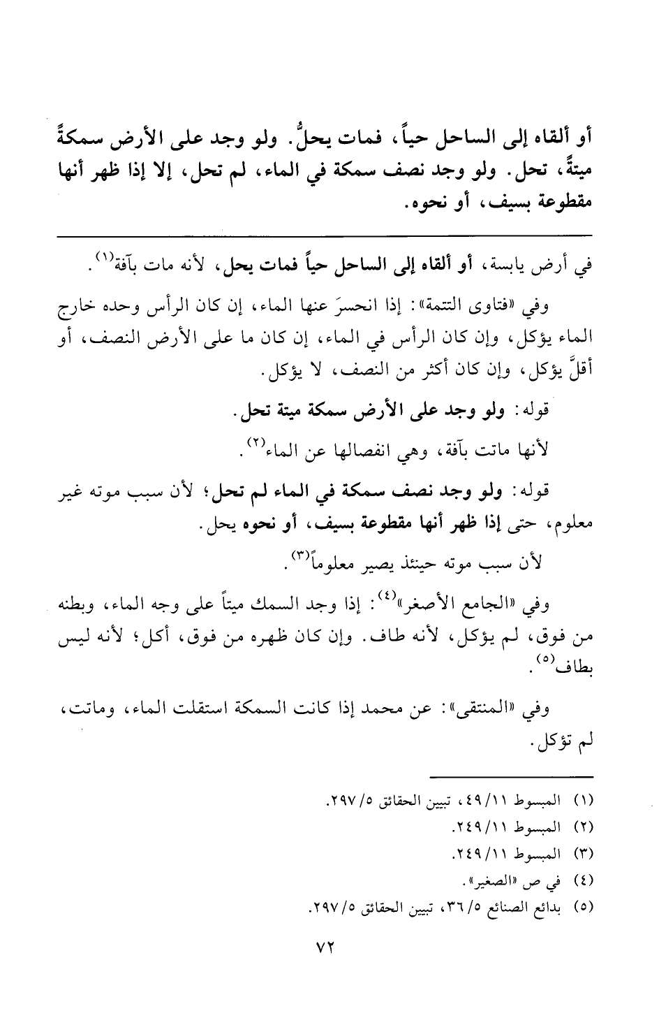 أو ألقاه إلى الساحل حيًا، فمات يحلُّ. ولو وجد على الأرض سمكةً ميتةً، تحل. ولو وجد نصف سمكة في الماء، لم تحل، إلا إذا ظهر أنها مقطوعة بسيف، أو نحوه.