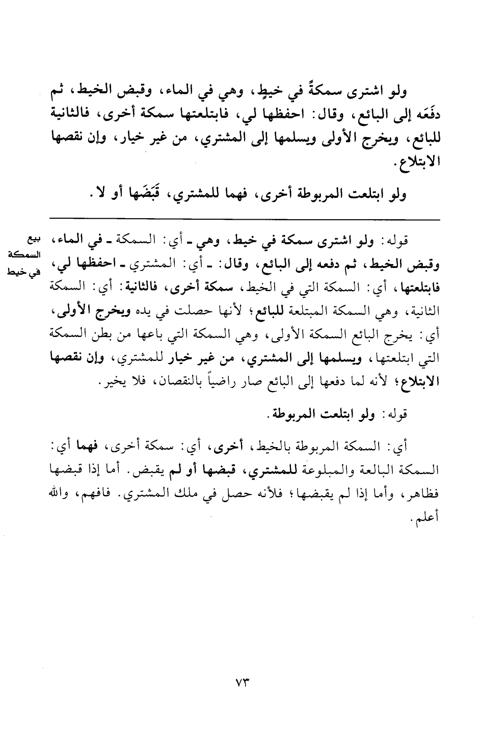 قوله: ولو اشترى سمكة في خيط، وهي -أي: السمكة- في الماء، وقبض الخيط، ثم دفعه إلى البائع، وقال: -أي: المشتري- احفظها لي، فابتلعتها، أي: السمكة التي في الخيط، سمكة أخرى، فالثانية: أي: السمكة الثانية، وهي السمكة المبتلعة للبائع؛ لأنها حصلت في يده ويخرج الأولى، أي: يخرج البائع السمكة الأولى، وهي السمكة التي باعها من بطن السمكة التي ابتلعتها، ويسلمها إلى المشتري، من غير خيار للمشتري، وإن نقصها الابتلاع؛ لأنه لما دفعها إلى البائع صار راضيًا بالنقصان، فلا يخير.