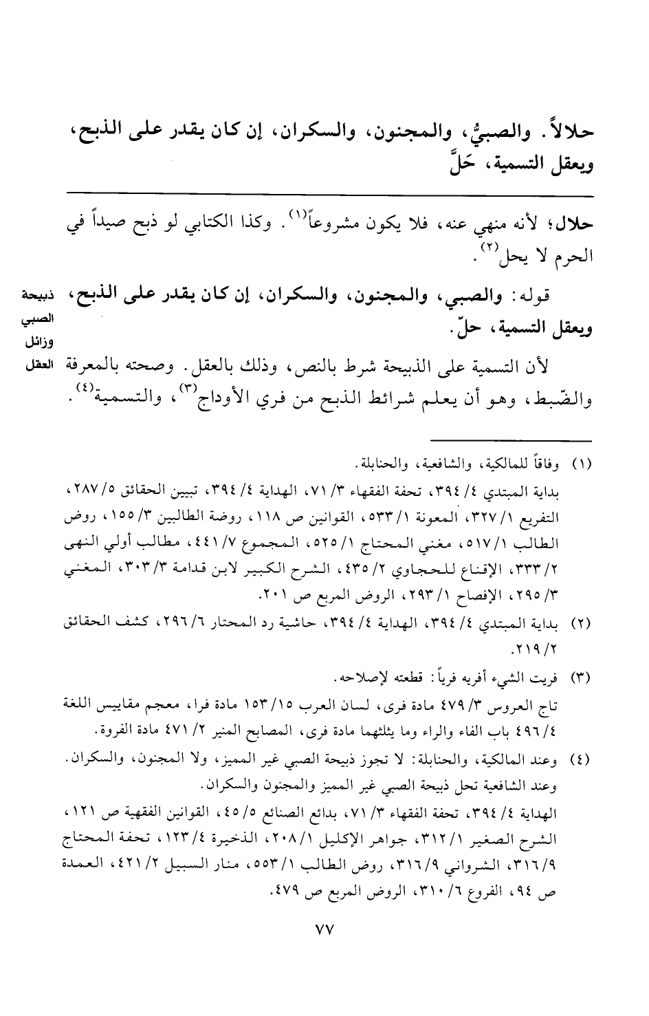 (¬٤) وعند المالكية، والحنابلة: لا تجوز ذبيحة الصبي غير المميز، ولا المجنون، والسكران.