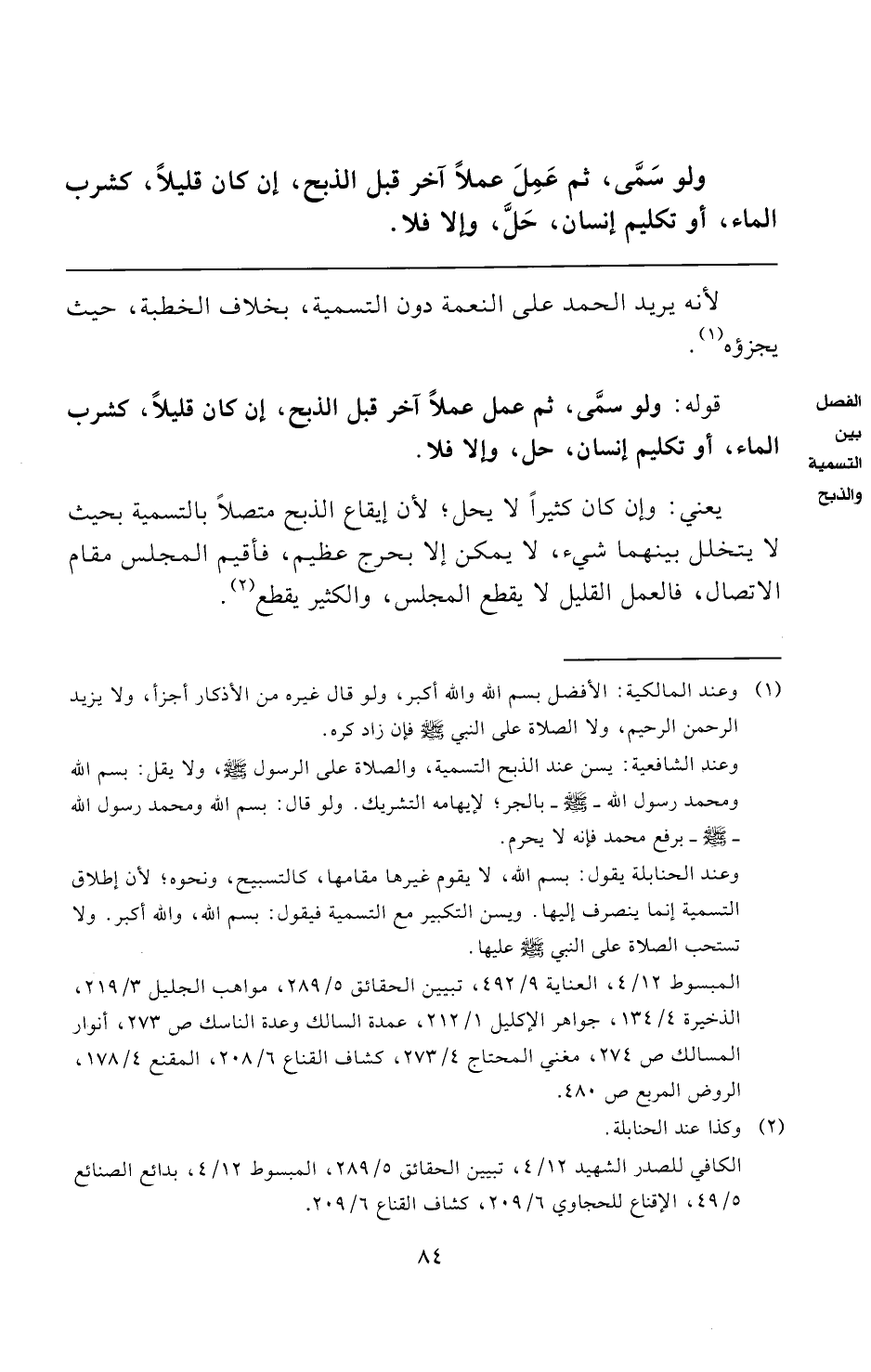 يعني: وإن كان كثيرًا لا يحل؛ لأن إيقاع الذبح متصلًا بالتسمية بحيث لا يتخلل بينهما شيء، لا يمكن إلا بحرج عظيم، فأقيم المجلس مقام الاتصال، فالعمل القليل لا يقطع المجلس، والكثير يقطع (¬٢).