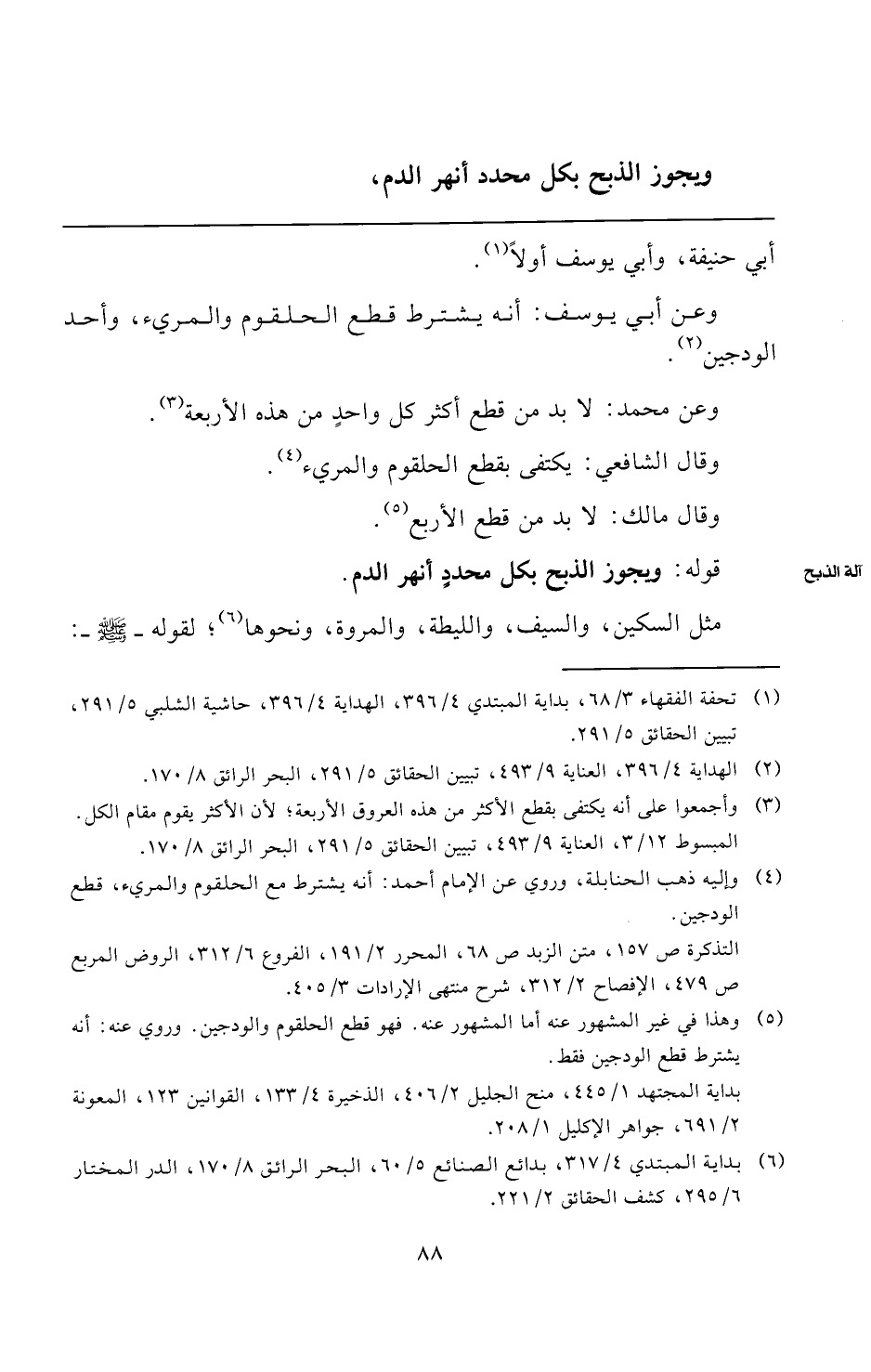 (¬٤) وإليه ذهب الحنابلة، وروي عن الإمام أحمد: أنه يشترط مع الحلقوم والمريء، قطع الودجين.