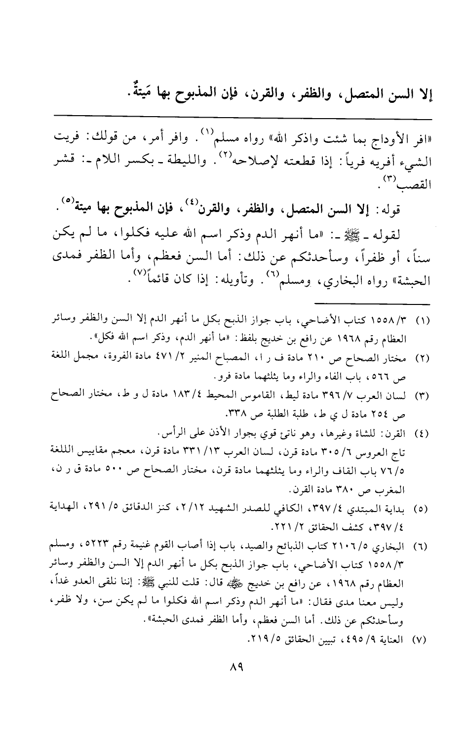 (¬٦) البخاري ٥/ ٢١٠٦ كتاب الذبائح والصيد، باب إذا أصاب القوم غنيمة رقم ٥٢٢٣، ومسلم ٣/ ١٥٥٨ كتاب الأضاحي، باب جواز الذبح بكل ما أنهر الدم إلا السن والظفر وسائر العظام رقم ١٩٦٨، عن رافع بن خديج -رضي الله عنه- قال: قلت للنبي -صلى الله عليه وسلم-: إننا نلقى العدو غدًا، وليس معنا مدى فقال: "ما أنهر الدم وذكر اسم الله فكلوا ما لم يكن سن، ولا ظفر، وسأحدثكم عن ذلك. أما السن فعظم، وأما الظفر فمدى الحبشة".