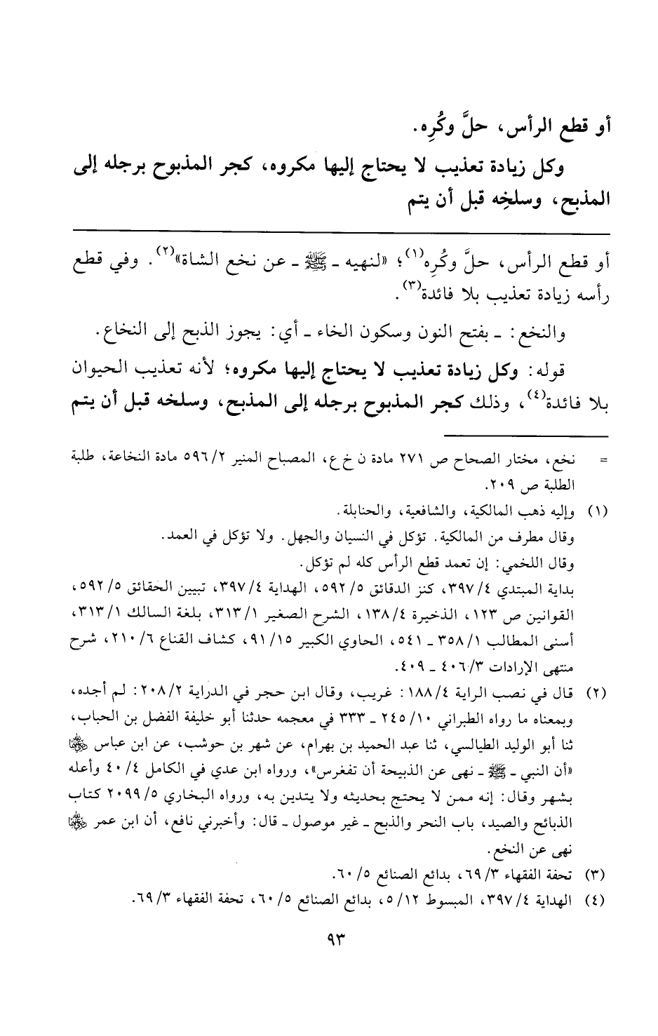 أو قطع الرأس، حلَّ وكُرِه (¬١)؛ "لنهيه -صلى الله عليه وسلم- عن نخع الشاة" (¬٢). وفي قطع رأسه زيادة تعذيب بلا فائدة (¬٣).