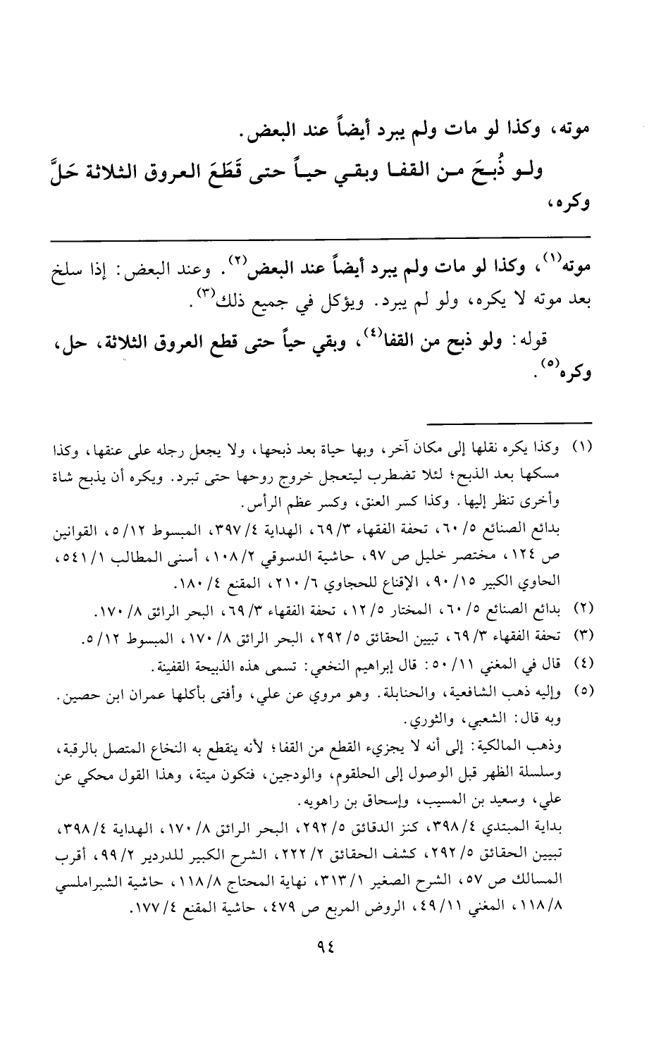 (¬١) وكذا يكره نقلها إلى مكان آخر، وبها حياة بعد ذبحها، ولا يجعل رجله على عنقها، وكذا مسكها بعد الذبح؛ لئلا تضطرب ليتعجل خروج روحها حتى تبرد. ويكره أن يذبح شاة وأخرى تنظر إليها. وكذا كسر العنق، وكسر عظم الرأس.