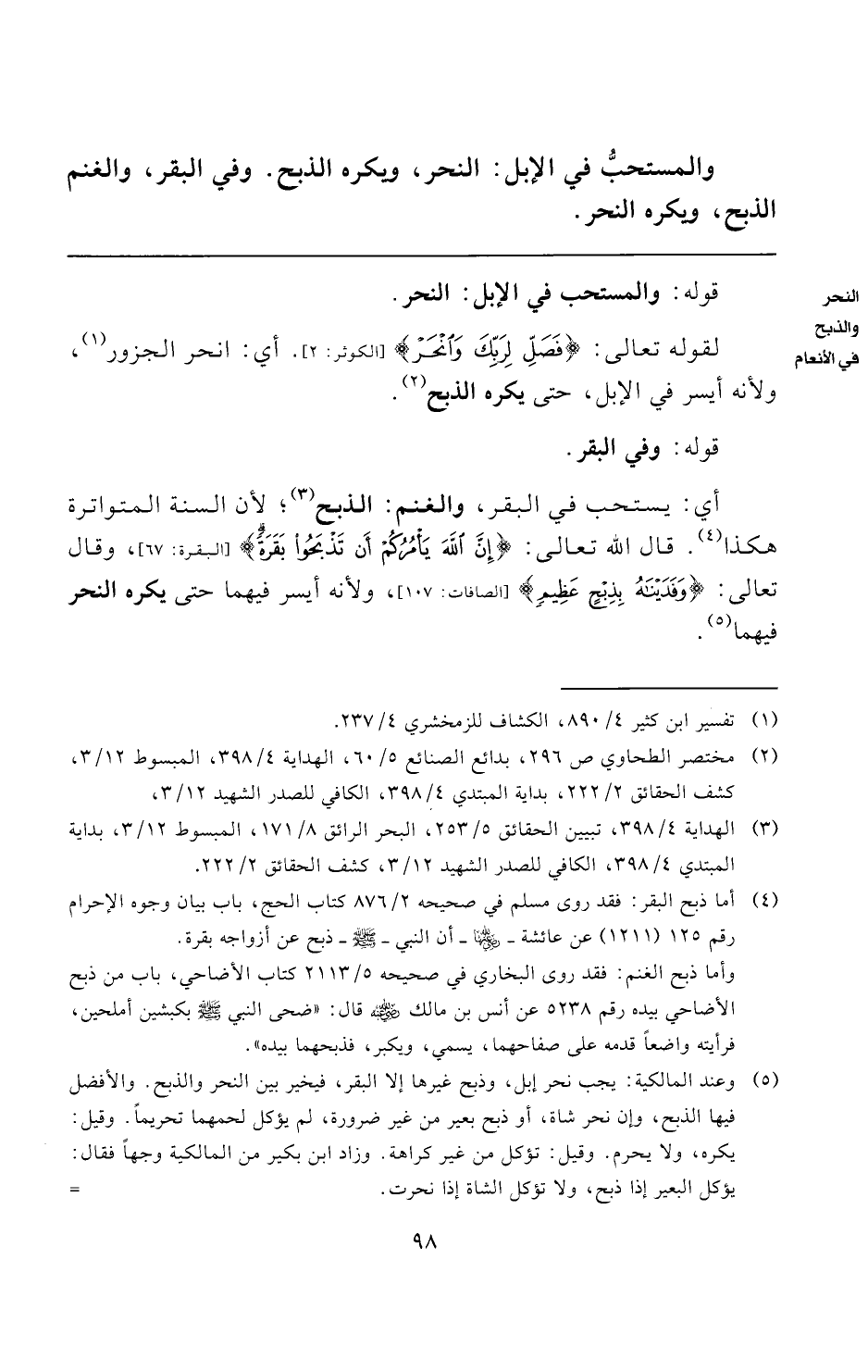 والمستحبُّ في الإبل: النحر، ويكره الذبح. وفي البقر، والغنم الذبح، ويكره النحر.