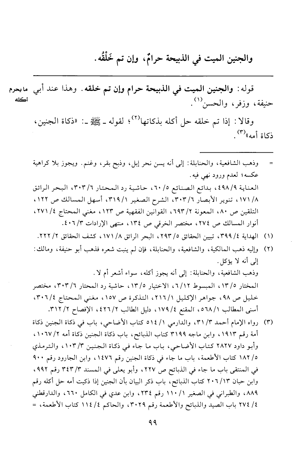 قوله: والجنين الميت في الذبيحة حرام وإن تم خلقه. وهذا عند أبي حنيفة، وزفر، والحسن (¬١).
