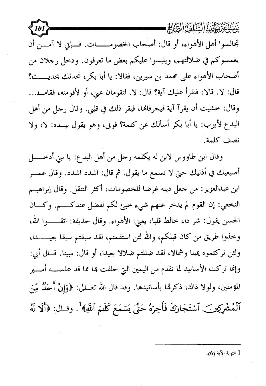 وقال ابن طاووس لابن له يكلمه رجل من أهل البدع: يا بني أدخل أصبعيك في أذنيك حتى لا تسمع ما يقول. ثم قال: اشدد اشدد. وقال عمر ابن عبد العزيز: من جعل دينه غرضا للخصومات، أكثر التنقل. وقال إبراهيم النخعي: إن القوم لم يدخر عنهم شيء خبئ لكم لفضل عندكم. وكان الحسن يقول: شر داء خالط قلبا، يعني: الأهواء. وقال حذيفة: اتقوا الله، وخذوا طريق من كان قبلكم، والله لئن استقمتم، لقد سبقتم سبقا بعيدا، ولئن تركتموه يمينا وشمالا، لقد ضللتم ضلالا بعيدا، أو قال: مبينا. قال أبي: وإنما تركت الأسانيد لما تقدم من اليمين التي حلفت بها مما قد علمه أمير المؤمنين، ولولا ذاك، ذكرتها بأسانيدها. وقد قال الله تعالى: {وَإِنْ أَحَدٌ مِنَ الْمُشْرِكِينَ اسْتَجَارَكَ فَأَجِرْهُ حَتَّى يَسْمَعَ كَلَامَ اللَّهِ} (¬1). وقال: {ألا لَهُ