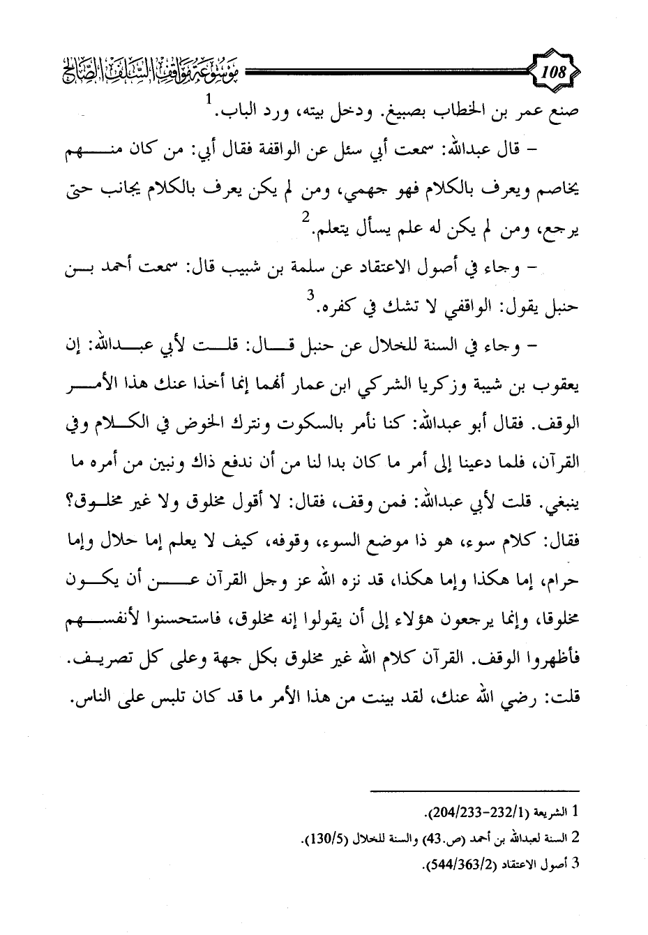 - وجاء في السنة للخلال عن حنبل قال: قلت لأبي عبد الله: إن يعقوب بن شيبة وزكريا الشركي ابن عمار أنهما إنما أخذا عنك هذا الأمر الوقف. فقال أبو عبد الله: كنا نأمر بالسكوت ونترك الخوض في الكلام وفي القرآن، فلما دعينا إلى أمر ما كان بدا لنا من أن ندفع ذاك ونبين من أمره ما ينبغي. قلت لأبي عبد الله: فمن وقف، فقال: لا أقول مخلوق ولا غير مخلوق؟ فقال: كلام سوء، هو ذا موضع السوء، وقوفه، كيف لا يعلم إما حلال وإما حرام، إما هكذا وإما هكذا، قد نزه الله عز وجل القرآن عن أن يكون مخلوقا، وإنما يرجعون هؤلاء إلى أن يقولوا إنه مخلوق، فاستحسنوا لأنفسهم فأظهروا الوقف. القرآن كلام الله غير مخلوق بكل جهة وعلى كل تصريف. قلت: رضي الله عنك، لقد بينت من هذا الأمر ما قد كان تلبس على الناس.