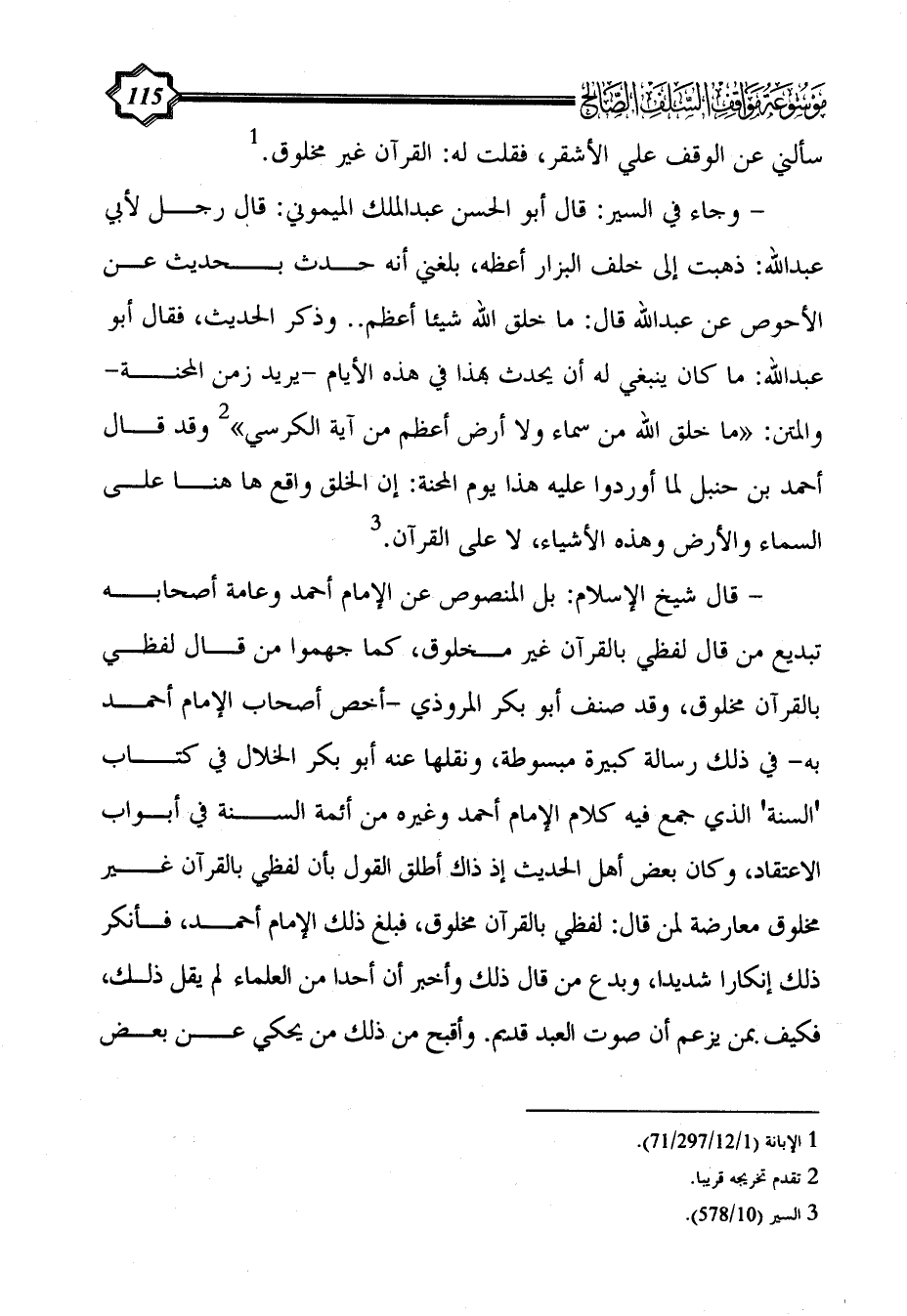 - قال شيخ الإسلام: بل المنصوص عن الإمام أحمد وعامة أصحابه تبديع من قال لفظي بالقرآن غير مخلوق، كما جهموا من قال لفظي بالقرآن مخلوق، وقد صنف أبو بكر المروذي -أخص أصحاب الإمام أحمد به- في ذلك رسالة كبيرة مبسوطة، ونقلها عنه أبو بكر الخلال في كتاب 'السنة' الذي جمع فيه كلام الإمام أحمد وغيره من أئمة السنة في أبواب الاعتقاد، وكان بعض أهل الحديث إذ ذاك أطلق القول بأن لفظي بالقرآن غير مخلوق معارضة لمن قال: لفظي بالقرآن مخلوق، فبلغ ذلك الإمام أحمد، فأنكر ذلك إنكارا شديدا، وبدع من قال ذلك وأخبر أن أحدا من العلماء لم يقل ذلك، فكيف بمن يزعم أن صوت العبد قديم. وأقبح من ذلك من يحكي عن بعض