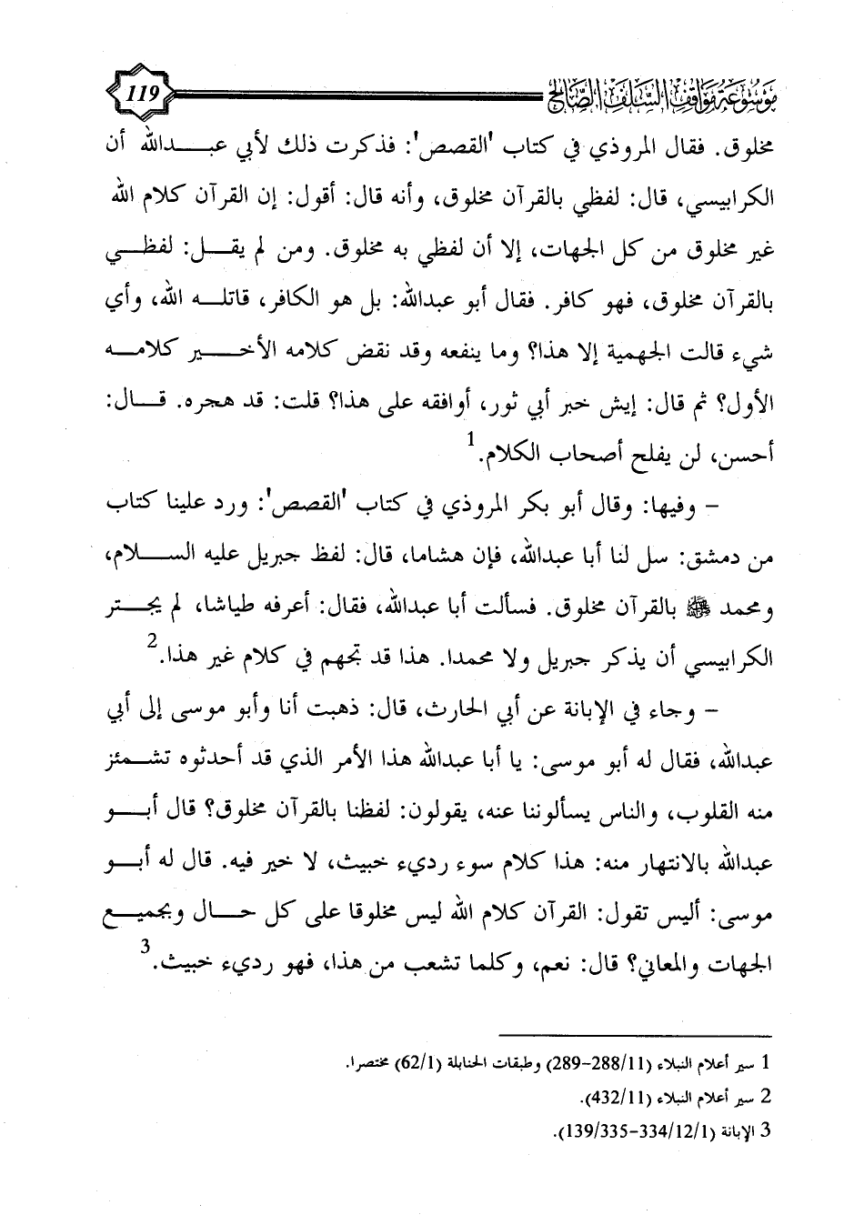 مخلوق. فقال المروذي في كتاب 'القصص': فذكرت ذلك لأبي عبد الله أن الكرابيسي، قال: لفظي بالقرآن مخلوق، وأنه قال: أقول: إن القرآن كلام الله غير مخلوق من كل الجهات، إلا أن لفظي به مخلوق. ومن لم يقل: لفظي بالقرآن مخلوق، فهو كافر. فقال أبو عبد الله: بل هو الكافر، قاتله الله، وأي شيء قالت الجهمية إلا هذا؟ وما ينفعه وقد نقض كلامه الأخير كلامه الأول؟ ثم قال: إيش خبر أبي ثور، أوافقه على هذا؟ قلت: قد هجره. قال: أحسن، لن يفلح أصحاب الكلام. (¬1)