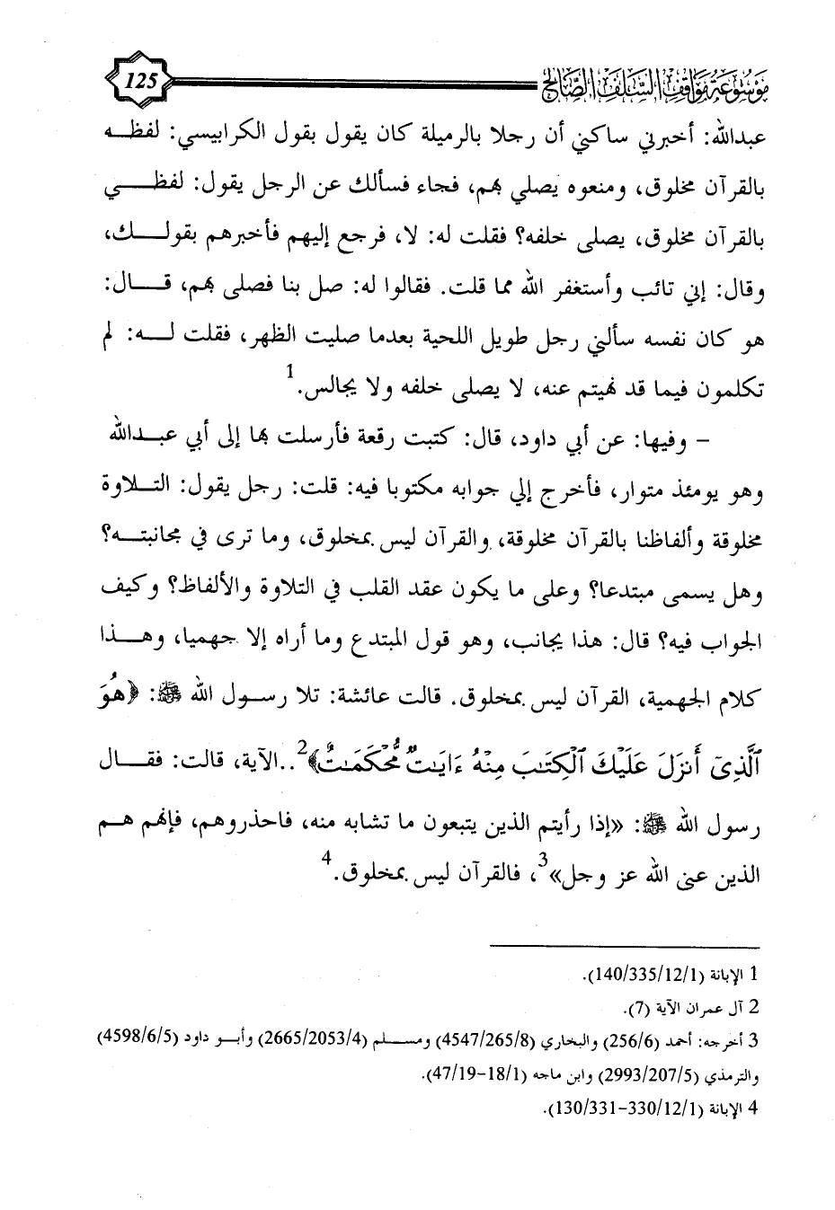 - وفيها: عن أبي داود، قال: كتبت رقعة فأرسلت بها إلى أبي عبد الله وهو يومئذ متوار، فأخرج إلي جوابه مكتوبا فيه: قلت: رجل يقول: التلاوة مخلوقة وألفاظنا بالقرآن مخلوقة، والقرآن ليس بمخلوق، وما ترى في مجانبته؟ وهل يسمى مبتدعا؟ وعلى ما يكون عقد القلب في التلاوة والألفاظ؟ وكيف الجواب فيه؟ قال: هذا يجانب، وهو قول المبتدع وما أراه إلا جهميا، وهذا كلام الجهمية، القرآن ليس بمخلوق. قالت عائشة: تلا رسول الله - صلى الله عليه وسلم -: {هُوَ الَّذِي أَنْزَلَ عَلَيْكَ الْكِتَابَ مِنْهُ آيَاتٌ مُحْكَمَاتٌ} (¬2) .. الآية، قالت: فقال رسول الله - صلى الله عليه وسلم -: "إذا رأيتم الذين يتبعون ما تشابه منه، فاحذروهم، فإنهم هم الذين عنى الله عز وجل" (¬3)، فالقرآن ليس بمخلوق. (¬4)