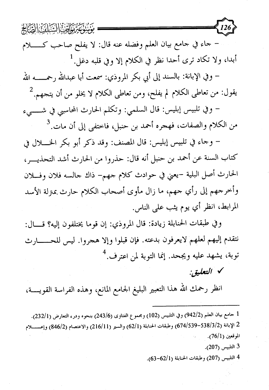 (¬1) جامع بيان العلم (2/ 942) وفي التلبيس (102) ومجموع الفتاوى (6/ 243) بنحوه ودرء التعارض (1/ 232).