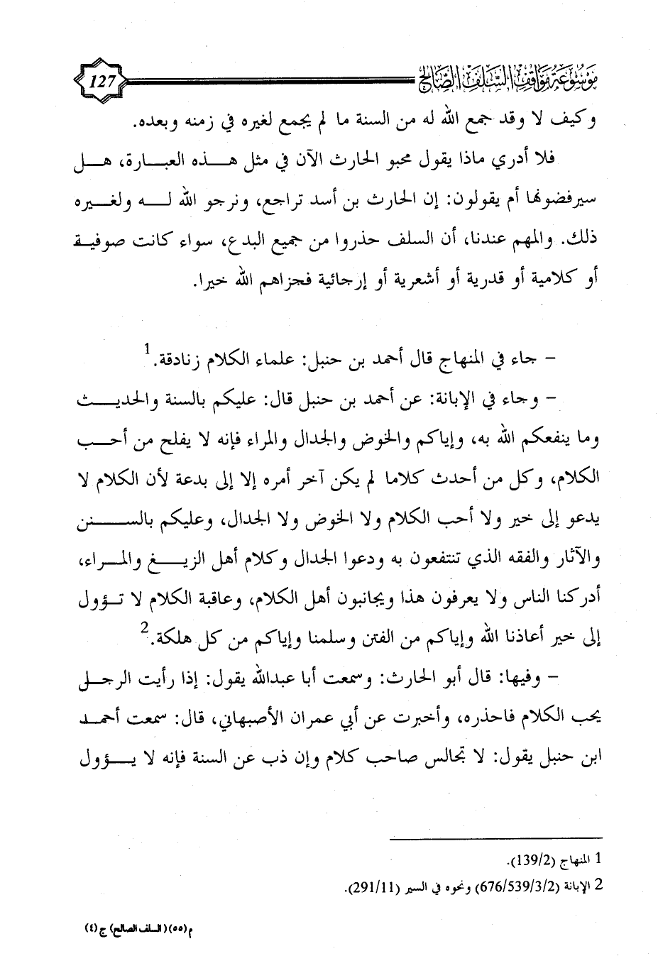 فلا أدري ماذا يقول محبو الحارث الآن في مثل هذه العبارة، هل سيرفضونها أم يقولون: إن الحارث بن أسد تراجع، ونرجو الله له ولغيره ذلك. والمهم عندنا، أن السلف حذروا من جميع البدع، سواء كانت صوفية أو كلامية أو قدرية أو أشعرية أو إرجائية فجزاهم الله خيرا.