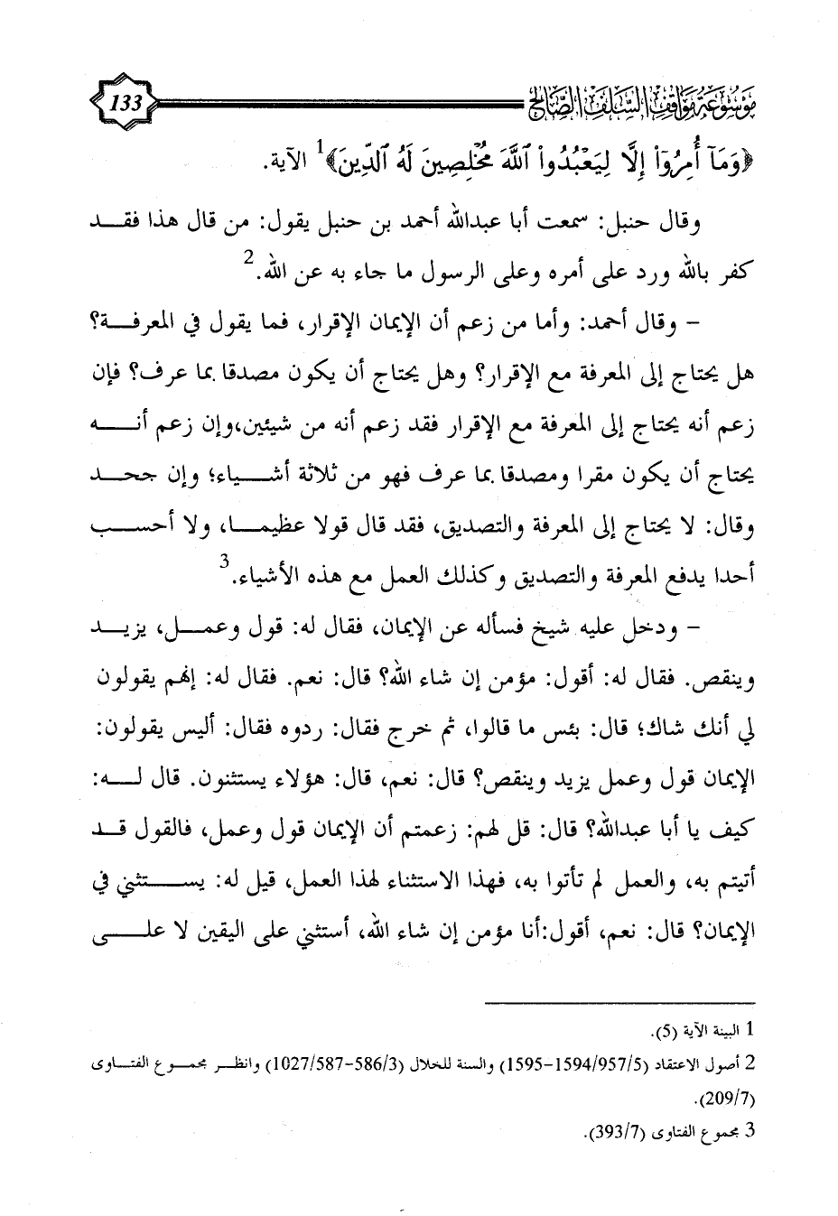 - وقال أحمد: وأما من زعم أن الإيمان الإقرار، فما يقول في المعرفة؟ هل يحتاج إلى المعرفة مع الإقرار؟ وهل يحتاج أن يكون مصدقا بما عرف؟ فإن زعم أنه يحتاج إلى المعرفة مع الإقرار فقد زعم أنه من شيئين، وإن زعم أنه يحتاج أن يكون مقرا ومصدقا بما عرف فهو من ثلاثة أشياء؛ وإن جحد وقال: لا يحتاج إلى المعرفة والتصديق، فقد قال قولا عظيما، ولا أحسب أحدا يدفع المعرفة والتصديق وكذلك العمل مع هذه الأشياء. (¬3)