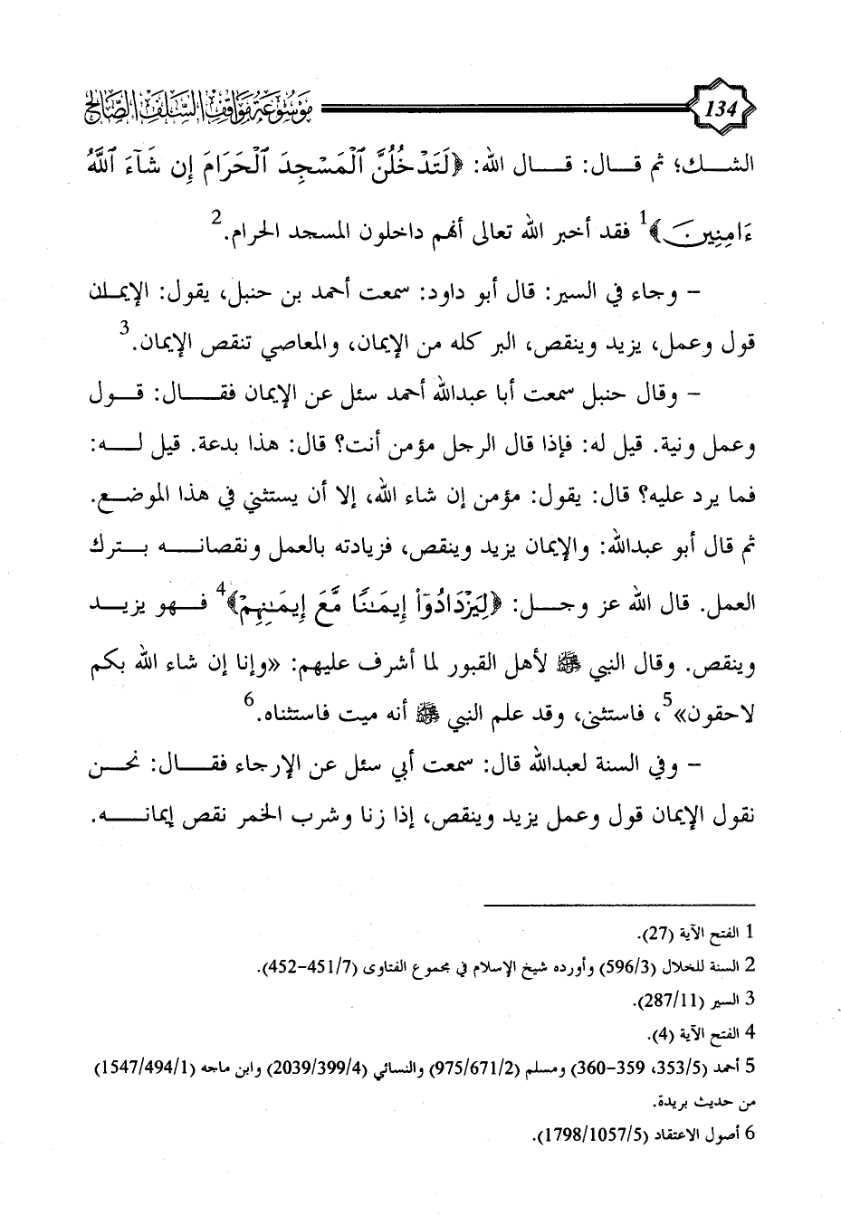 - وقال حنبل سمعت أبا عبد الله أحمد سئل عن الإيمان فقال: قول وعمل ونية. قيل له: فإذا قال الرجل مؤمن أنت؟ قال: هذا بدعة. قيل له: فما يرد عليه؟ قال: يقول: مؤمن إن شاء الله، إلا أن يستثني في هذا الموضع. ثم قال أبو عبد الله: والإيمان يزيد وينقص، فزيادته بالعمل ونقصانه بترك العمل. قال الله عز وجل: {لِيَزْدَادُوا إِيمَانًا مَعَ إِيمَانِهِمْ} (¬4) فهو يزيد وينقص. وقال النبي - صلى الله عليه وسلم - لأهل القبور لما أشرف عليهم: "وإنا إن شاء الله بكم لاحقون" (¬5)، فاستثنى، وقد علم النبي - صلى الله عليه وسلم - أنه ميت فاستثناه. (¬6)