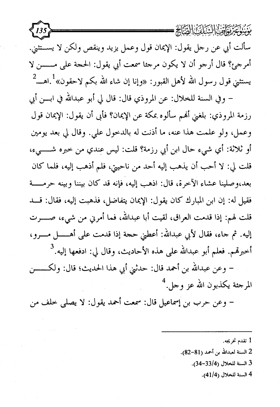 - وفي السنة للخلال: عن المروذي قال: قال لي أبو عبد الله في ابن أبي رزمة المروذي: بلغني أنهم سألوه بمكة عن الإيمان؟ فأبى أن يقول: الإيمان قول وعمل، ولو علمت هذا عنه، ما أذنت له بالدخول علي. وقال لي بعد يومين أو ثلاثة: أي شيء حال ابن أبي رزمة؟ قلت: ليس عندي من خبره شيء، قلت لي: لا أحب أن يذهب إليه أحد من ناحيتي، فلم أذهب إليه، فلما كان بعد، وصلينا عشاء الآخرة، قال: اذهب إليه، فإنه قد كان بيننا وبينه حرمة فقيل له: إن ابن المبارك كان يقول: الإيمان يتفاضل، فذهبت إليه، فقال: قد قلت لهم: إذا قدمت العراق، لقيت أبا عبد الله، فما أمرني من شيء، صرت إليه. ثم جاء، فقال لأبي عبد الله: أعطني حجة إذا قدمت على أهل مرو، أخبرتهم. فعلم أبو عبد الله على هذه الأحاديث، وقال لي: ادفعها إليه. (¬3)