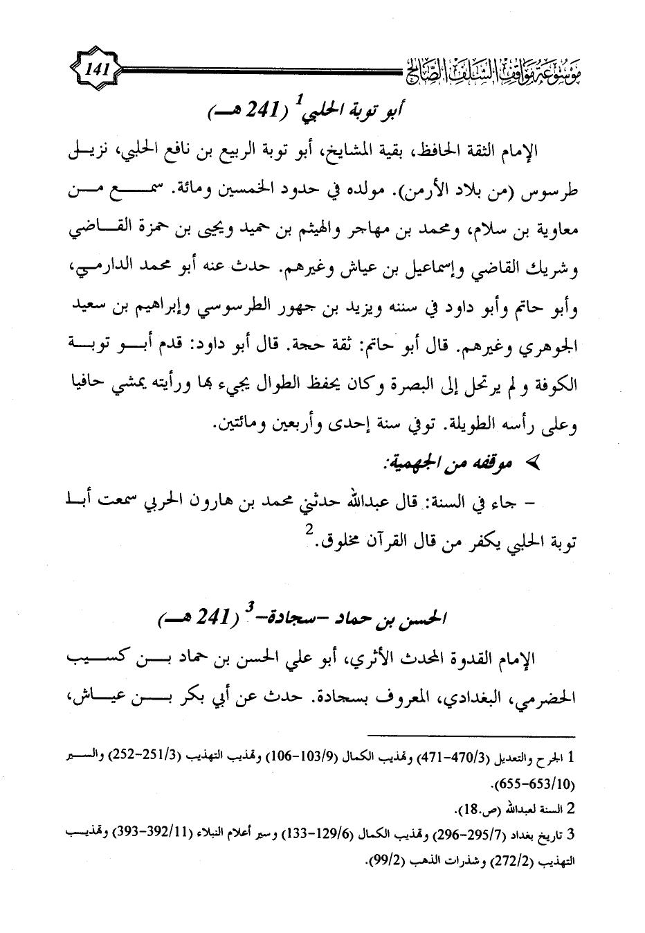 - جاء في السنة: قال عبد الله حدثني محمد بن هارون الحربي سمعت أبا توبة الحلبي يكفر من قال القرآن مخلوق. (¬2)