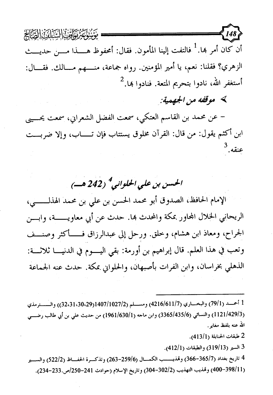 (¬4) تاريخ بغداد (7/ 365 - 366) وتهذيب الكمال (6/ 259 - 263) وتذكرة الحفاظ (2/ 522) والسير ... (11/ 398 - 400) وتهذيب التهذيب (2/ 302 - 304) وتاريخ الإسلام (حوادث 241 - 250/ص.233 - 234).