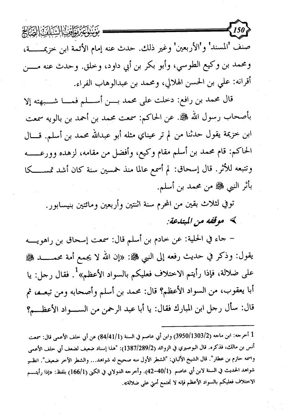 - جاء في الحلية: عن خادم بن أسلم قال: سمعت إسحاق بن راهويه يقول: وذكر في حديث رفعه إلى النبي - صلى الله عليه وسلم -: "إن الله لا يجمع أمة محمد - صلى الله عليه وسلم - على ضلالة، فإذا رأيتم الاختلاف فعليكم بالسواد الأعظم" (¬1). فقال رجل: يا أبا يعقوب، من السواد الأعظم؟ قال: محمد بن أسلم وأصحابه ومن تبعه، ثم قال: سأل رجل ابن المبارك فقال: يا أبا عبد الرحمن من السواد الأعظم؟