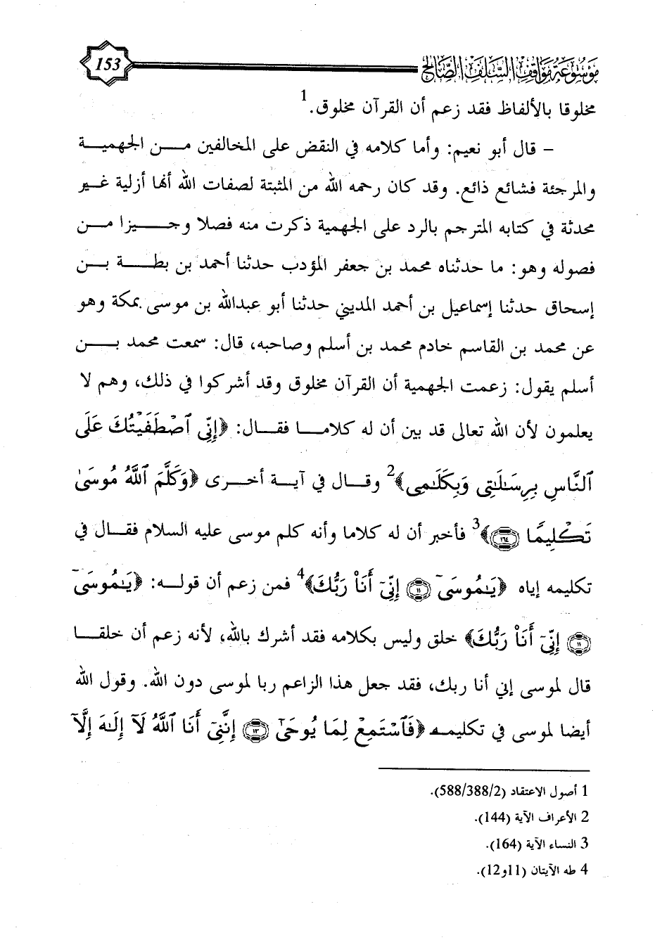 - قال أبو نعيم: وأما كلامه في النقض على المخالفين من الجهمية والمرجئة فشائع ذائع. وقد كان رحمه الله من المثبتة لصفات الله أنها أزلية غير محدثة في كتابه المترجم بالرد على الجهمية ذكرت منه فصلا وجيزا من فصوله وهو: ما حدثناه محمد بن جعفر المؤدب حدثنا أحمد بن بطة بن إسحاق حدثنا إسماعيل بن أحمد المديني حدثنا أبو عبد الله بن موسى بمكة وهو عن محمد بن القاسم خادم محمد بن أسلم وصاحبه، قال: سمعت محمد بن أسلم يقول: زعمت الجهمية أن القرآن مخلوق وقد أشركوا في ذلك، وهم لا يعلمون لأن الله تعالى قد بين أن له كلاما فقال: {إِنِّي اصْطَفَيْتُكَ عَلَى النَّاسِ بِرِسَالَاتِي وَبِكَلَامِي} (¬2) وقال في آية أخرى {وكلم الله موسى تكليمًا} (¬3) فأخبر أن له كلاما وأنه كلم موسى عليه السلام فقال في تكليمه إياه {يَا مُوسَى (11) إِنِّي أَنَا رَبُّكَ} (¬4) فمن زعم أن قوله: {يَا مُوسَى (11) إِنِّي أَنَا رَبُّكَ} خلق وليس بكلامه فقد أشرك بالله، لأنه زعم أن خلقا قال لموسى إني أنا ربك، فقد جعل هذا الزاعم ربا لموسى دون الله. وقول الله أيضا لموسى في تكليمه {فَاسْتَمِعْ لِمَا يُوحَى (13) إِنَّنِي أَنَا اللَّهُ لَا إِلَهَ إِلَّا