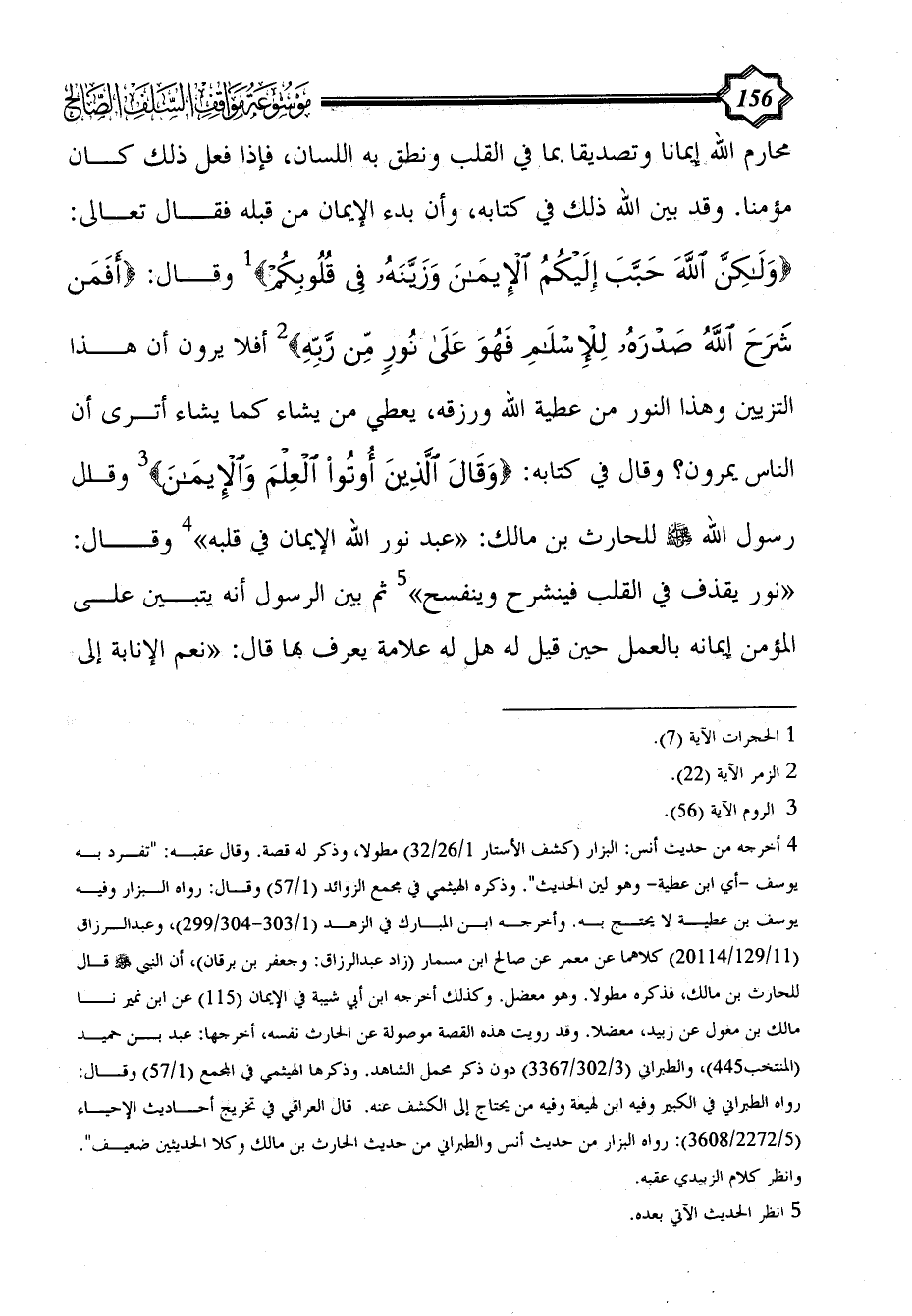 وقال: {أَفَمَنْ شَرَحَ اللَّهُ صَدْرَهُ لِلْإِسْلَامِ فَهُوَ عَلَى نُورٍ مِنْ رَبِّهِ} (¬2) أفلا يرون أن هذا التزيين وهذا النور من عطية الله ورزقه، يعطي من يشاء كما يشاء أترى أن الناس يمرون؟ وقال في كتابه: {وَقَالَ الَّذِينَ أُوتُوا الْعِلْمَ والإيمان} (¬3) وقال رسول الله - صلى الله عليه وسلم - للحارث بن مالك: "عَبْدٌ نَوَّرَ الله الإيمان في قلبه" (¬4) وقال: "نور يقذف في القلب فينشرح وينفسح" (¬5)