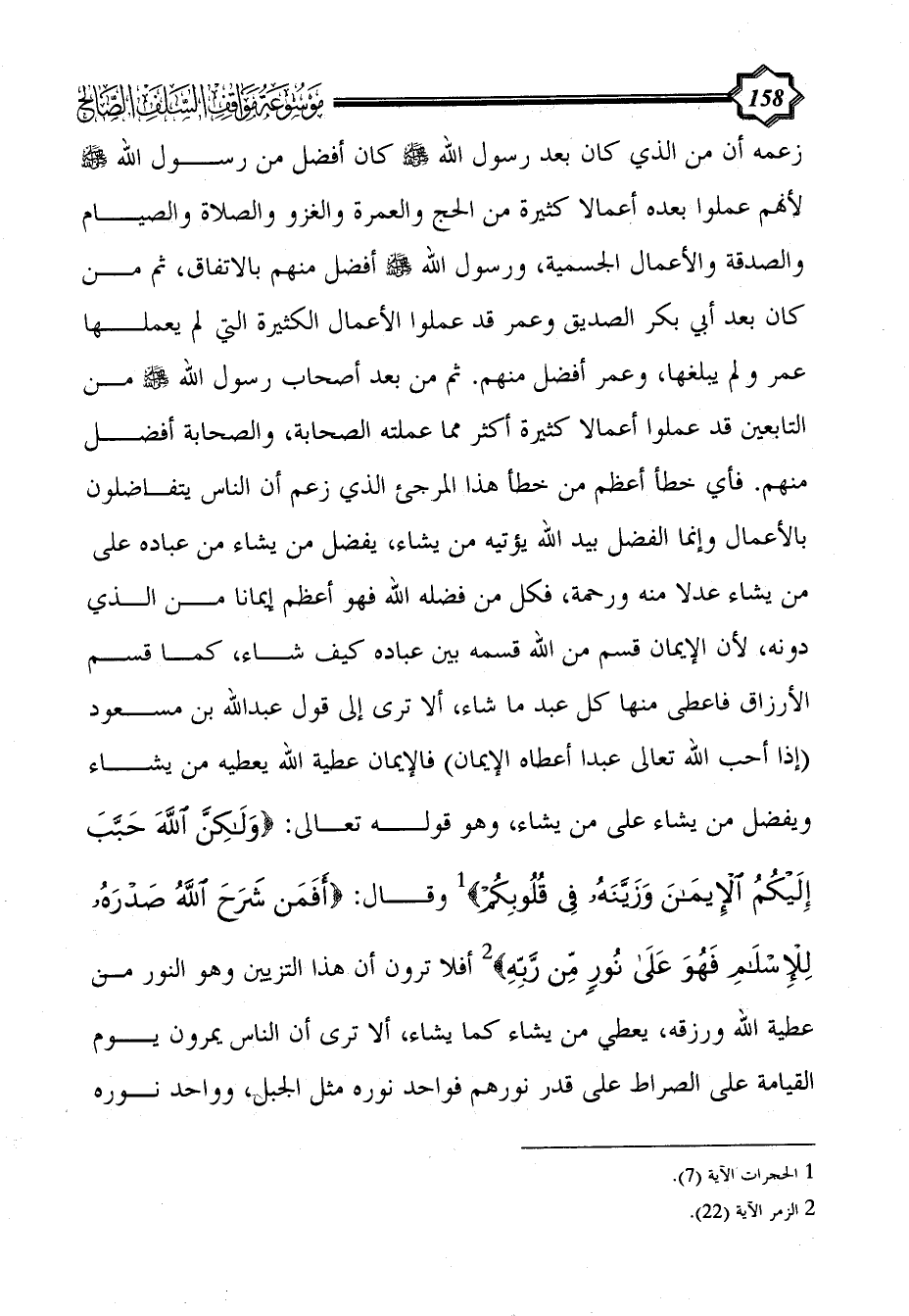 زعمه أن من الذي كان بعد رسول الله - صلى الله عليه وسلم - كان أفضل من رسول الله - صلى الله عليه وسلم - لأنهم عملوا بعده أعمالا كثيرة من الحج والعمرة والغزو والصلاة والصيام والصدقة والأعمال الجسمية، ورسول الله - صلى الله عليه وسلم - أفضل منهم بالاتفاق، ثم من كان بعد أبي بكر الصديق وعمر قد عملوا الأعمال الكثيرة التي لم يعملها عمر ولم يبلغها، وعمر أفضل منهم. ثم من بعد أصحاب رسول الله - صلى الله عليه وسلم - من التابعين قد عملوا أعمالا كثيرة أكثر مما عملته الصحابة، والصحابة أفضل منهم. فأي خطأ أعظم من خطأ هذا المرجئ الذي زعم أن الناس يتفاضلون بالأعمال وإنما الفضل بيد الله يؤتيه من يشاء، يفضل من يشاء من عباده على من يشاء عدلا منه ورحمة، فكل من فضله الله فهو أعظم إيمانا من الذي دونه، لأن الإيمان قسم من الله قسمه بين عباده كيف شاء، كما قسم الأرزاق فاعطى منها كل عبد ما شاء، ألا ترى إلى قول عبد الله بن مسعود (إذا أحب الله تعالى عبدا أعطاه الإيمان) فالإيمان عطية الله يعطيه من يشاء ويفضل من يشاء على من يشاء، وهو قوله تعالى: {وَلَكِنَّ اللَّهَ حَبَّبَ إِلَيْكُمُ الْإِيمَانَ وَزَيَّنَهُ فِي قُلُوبِكُمْ} (¬1) وقال: {أَفَمَنْ شَرَحَ اللَّهُ صَدْرَهُ لِلْإِسْلَامِ فَهُوَ عَلَى نُورٍ مِنْ رَبِّهِ} (¬2) أفلا ترون أن هذا التزيين وهو النور من عطية الله ورزقه، يعطي من يشاء كما يشاء، ألا ترى أن الناس يمرون يوم القيامة على الصراط على قدر نورهم فواحد نوره مثل الجبل، وواحد نوره