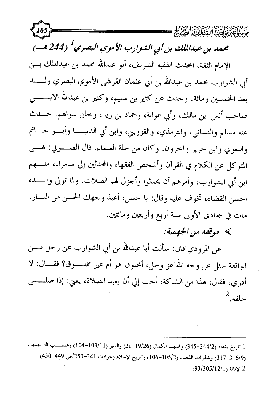 - عن المروذي قال: سألت أبا عبد الله بن أبي الشوارب عن رجل من الواقفة سئل عن وجه الله عز وجل، أمخلوق هو أم غير مخلوق؟ فقال: لا أدري. فقال: هذا من الشاكة، أحب إلي أن يعيد الصلاة، يعني: إذا صلى خلفه. (¬2)