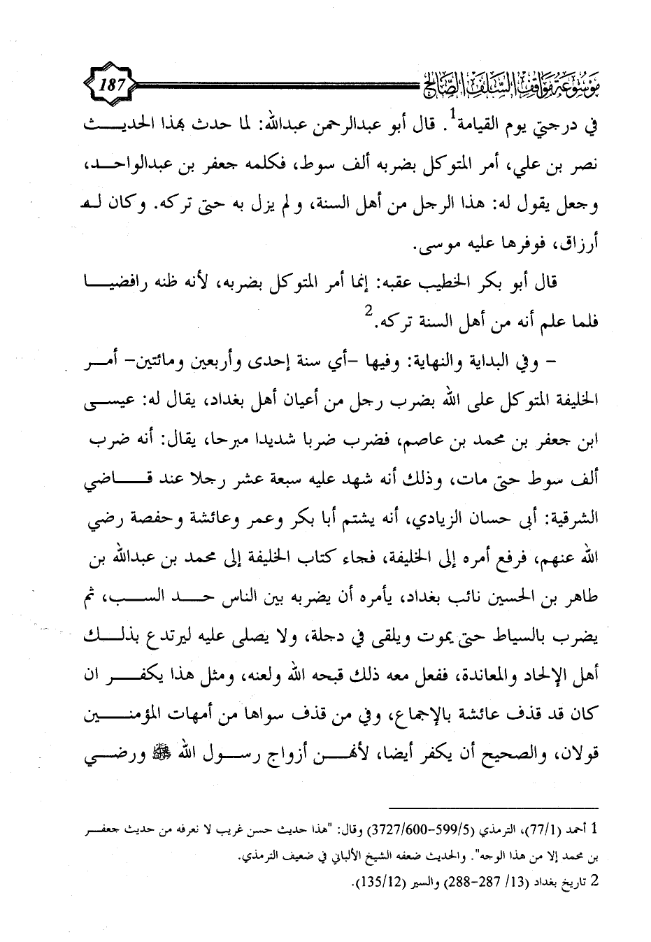 - وفي البداية والنهاية: وفيها -أي سنة إحدى وأربعين ومائتين- أمر الخليفة المتوكل على الله بضرب رجل من أعيان أهل بغداد، يقال له: عيسى ابن جعفر بن محمد بن عاصم، فضرب ضربا شديدا مبرحا، يقال: أنه ضرب ألف سوط حتى مات، وذلك أنه شهد عليه سبعة عشر رجلا عند قاضي الشرقية: أبى حسان الزيادي، أنه يشتم أبا بكر وعمر وعائشة وحفصة رضي الله عنهم، فرفع أمره إلى الخليفة، فجاء كتاب الخليفة إلى محمد بن عبد الله بن طاهر بن الحسين نائب بغداد، يأمره أن يضربه بين الناس حد السب، ثم يضرب بالسياط حتى يموت ويلقى في دجلة، ولا يصلى عليه ليرتدع بذلك أهل الإلحاد والمعاندة، ففعل معه ذلك قبحه الله ولعنه، ومثل هذا يكفر ان كان قد قذف عائشة بالإجماع، وفي من قذف سواها من أمهات المؤمنين قولان، والصحيح أن يكفر أيضا، لأنهن أزواج رسول الله - صلى الله عليه وسلم - ورضي