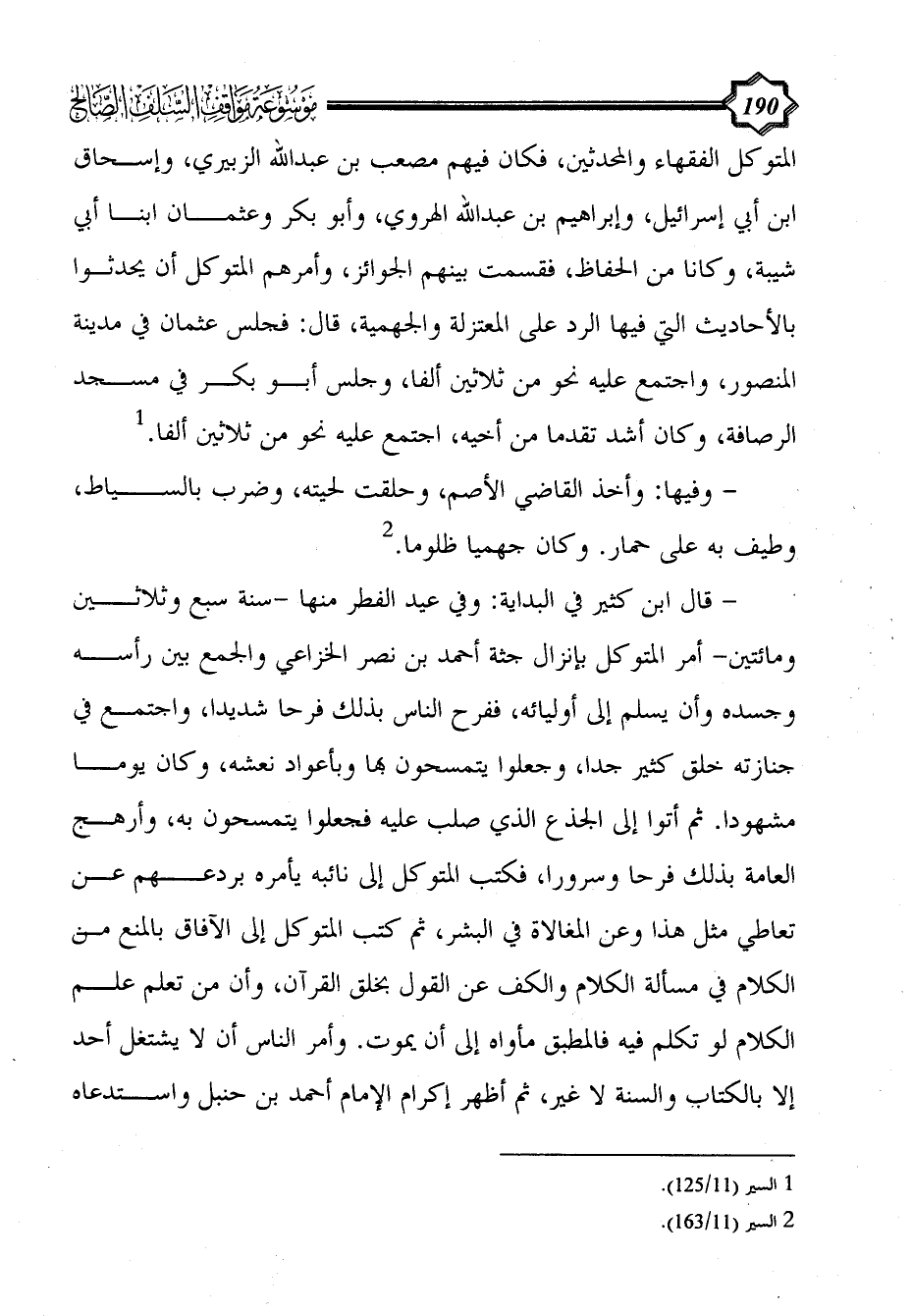 - قال ابن كثير في البداية: وفي عيد الفطر منها -سنة سبع وثلاثين ومائتين- أمر المتوكل بإنزال جثة أحمد بن نصر الخزاعي والجمع بين رأسه وجسده وأن يسلم إلى أوليائه، ففرح الناس بذلك فرحا شديدا، واجتمع في جنازته خلق كثير جدا، وجعلوا يتمسحون بها وبأعواد نعشه، وكان يوما مشهودا. ثم أتوا إلى الجذع الذي صلب عليه فجعلوا يتمسحون به، وأرهج العامة بذلك فرحا وسرورا، فكتب المتوكل إلى نائبه يأمره بردعهم عن تعاطي مثل هذا وعن المغالاة في البشر، ثم كتب المتوكل إلى الآفاق بالمنع من الكلام في مسألة الكلام والكف عن القول بخلق القرآن، وأن من تعلم علم الكلام لو تكلم فيه فالمطبق مأواه إلى أن يموت. وأمر الناس أن لا يشتغل أحد إلا بالكتاب والسنة لا غير، ثم أظهر إكرام الإمام أحمد بن حنبل واستدعاه