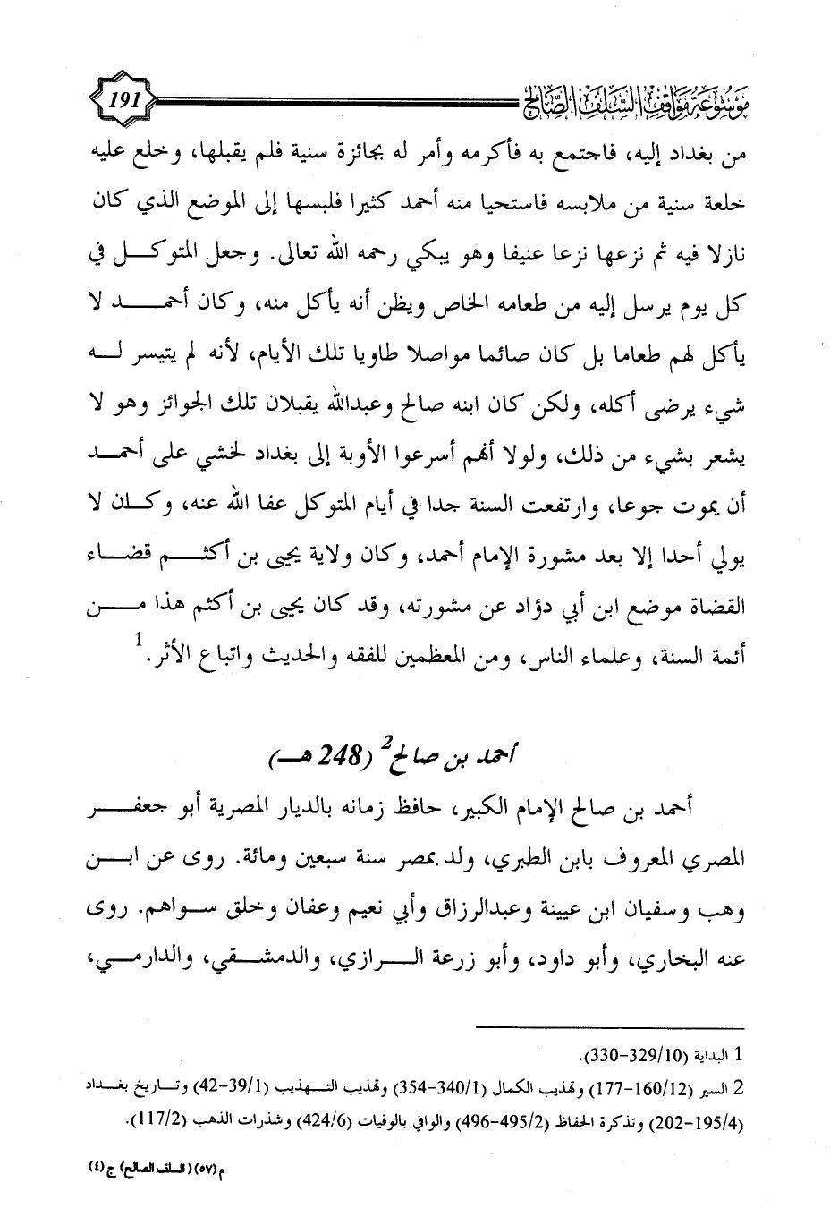 من بغداد إليه، فاجتمع به فأكرمه وأمر له بجائزة سنية فلم يقبلها، وخلع عليه خلعة سنية من ملابسه فاستحيا منه أحمد كثيرا فلبسها إلى الموضع الذي كان نازلا فيه ثم نزعها نزعا عنيفا وهو يبكي رحمه الله تعالى. وجعل المتوكل في كل يوم يرسل إليه من طعامه الخاص ويظن أنه يأكل منه، وكان أحمد لا يأكل لهم طعاما بل كان صائما مواصلا طاويا تلك الأيام، لأنه لم يتيسر له شيء يرضى أكله، ولكن كان ابنه صالح وعبد الله يقبلان تلك الجوائز وهو لا يشعر بشيء من ذلك، ولولا أنهم أسرعوا الأوبة إلى بغداد لخشي على أحمد أن يموت جوعا، وارتفعت السنة جدا في أيام المتوكل عفا الله عنه، وكان لا يولي أحدا إلا بعد مشورة الإمام أحمد، وكان ولاية يحيى بن أكثم قضاء القضاة موضع ابن أبي دؤاد عن مشورته، وقد كان يحيى بن أكثم هذا من أئمة السنة، وعلماء الناس، ومن المعظمين للفقه والحديث واتباع الأثر. (¬1)