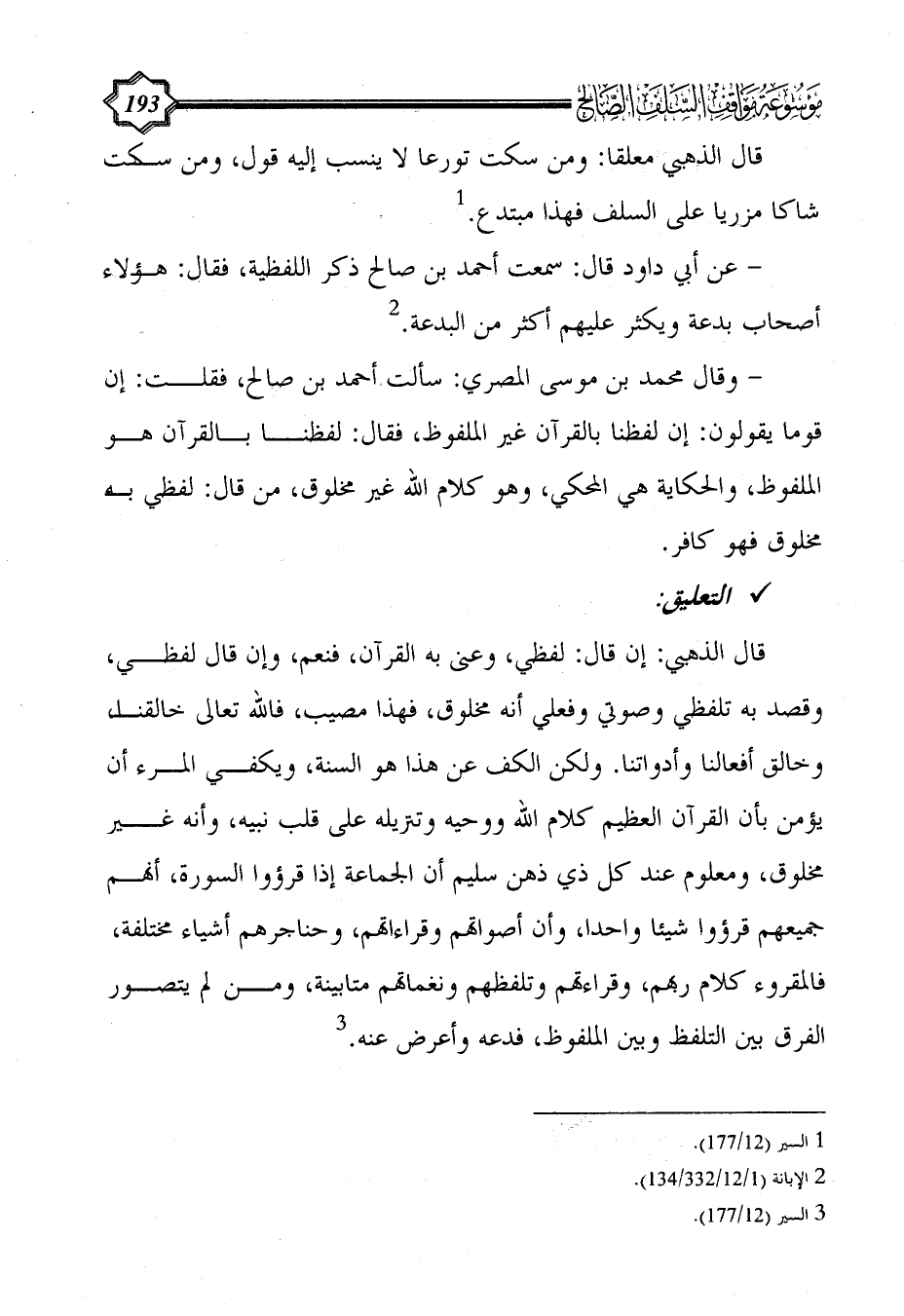 قال الذهبي: إن قال: لفظي، وعنى به القرآن، فنعم، وإن قال لفظي، وقصد به تلفظي وصوتي وفعلي أنه مخلوق، فهذا مصيب، فالله تعالى خالقنا، وخالق أفعالنا وأدواتنا. ولكن الكف عن هذا هو السنة، ويكفي المرء أن يؤمن بأن القرآن العظيم كلام الله ووحيه وتنزيله على قلب نبيه، وأنه غير مخلوق، ومعلوم عند كل ذي ذهن سليم أن الجماعة إذا قرؤوا السورة، أنهم جميعهم قرؤوا شيئا واحدا، وأن أصواتهم وقراءاتهم، وحناجرهم أشياء مختلفة، فالمقروء كلام ربهم، وقراءتهم وتلفظهم ونغماتهم متابينة، ومن لم يتصور الفرق بين التلفظ وبين الملفوظ، فدعه وأعرض عنه. (¬3)